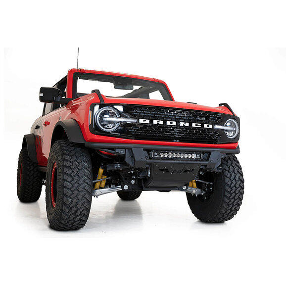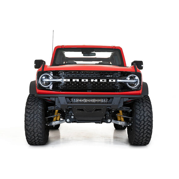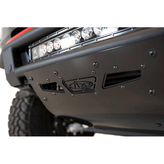 The ADD Offroad PRO Bolt-On Front Bumper for the Ford Bronco was designed with the lowest profile fitment possible without having to cut your Broncos frame. The upper .120-inch wall steel tube follows the contours of the front of your Bronco and is joined to steel plating and additional steel tubing at the middle of the bumper. A 1/8-inch vented aluminum skid plate extends towards the undercarriage to provide added protection. The venting in the skid plate ensures proper airflow to your factory intercooler.