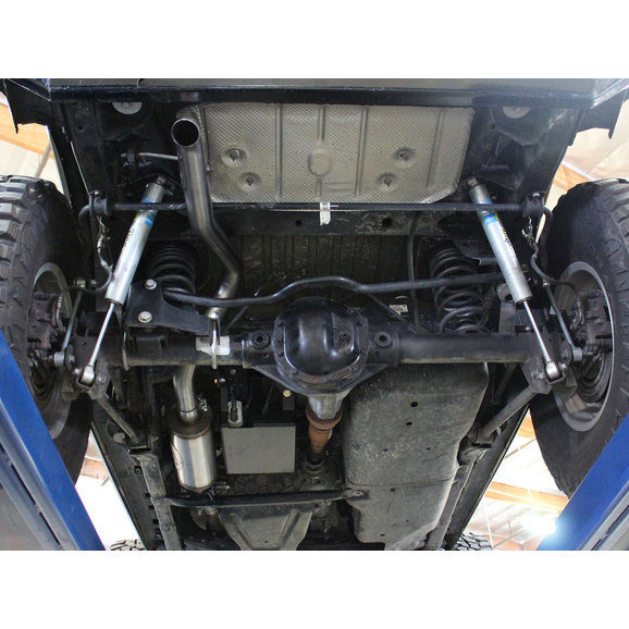 Forward Muffler Location: This system incorporates a large 14" length 2-layer aluminized steel chambered muffler for an aggressive sound while eliminating exhaust drone. The muffler is located prior to the rear axle for increased climbing angles.