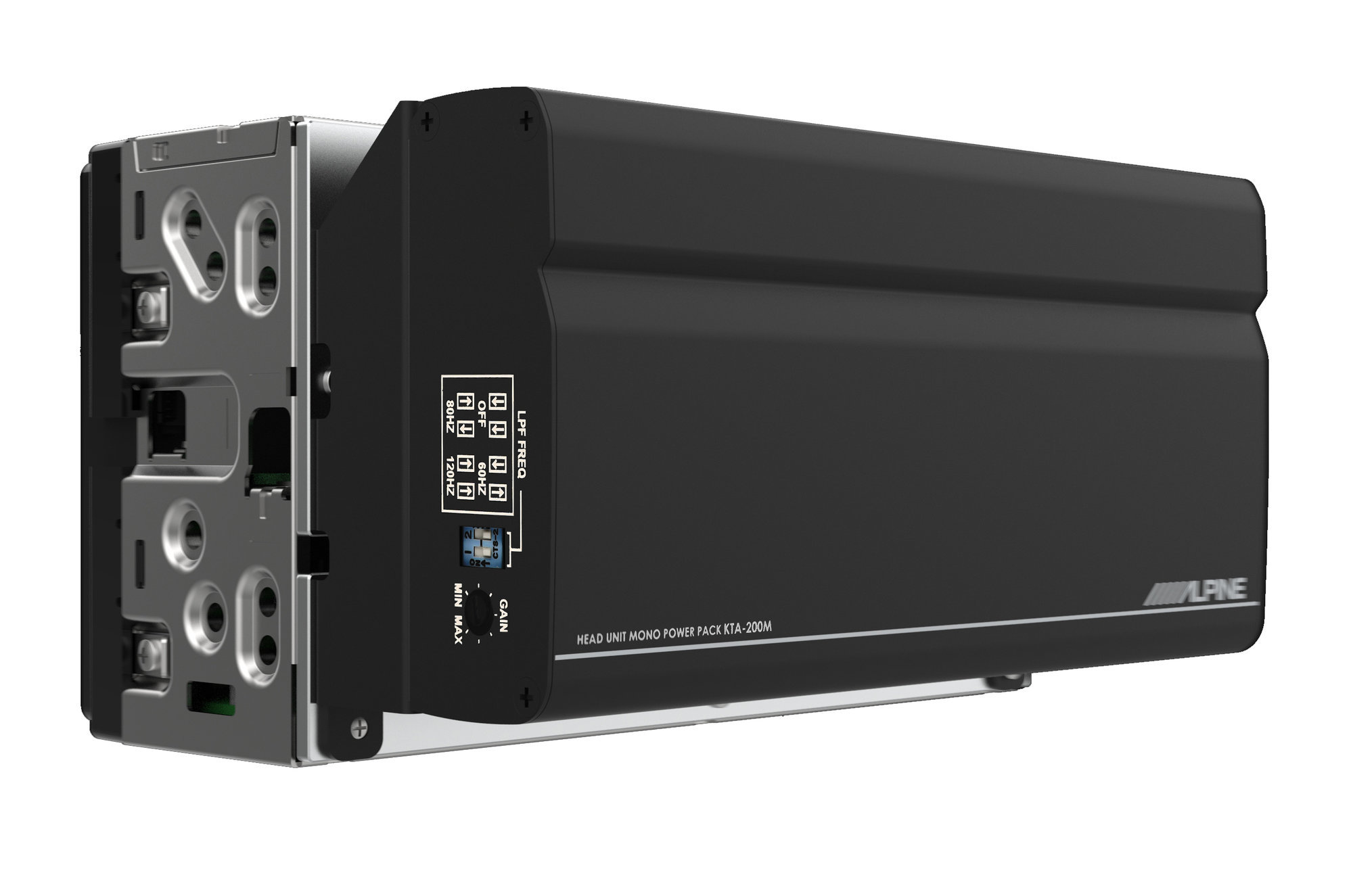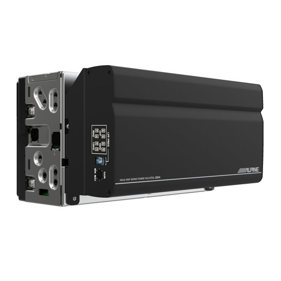 Big things come in small packages, and this point is proven with the Alpine KTA-200M Mono Power Pack Amplifier. This compact subwoofer amplifier features Alpine’s exclusive dynamic peak power (DPP) technology. DPP allows the KTA-200M to have 400-watt peak power while only measuring 7” x 3.5” x 1.25”. Because of its compact design, the KTA-200M can be mounted to the back of the Alpine iLX-W650. Alpine includes a plug and play harness and their PowerStack bracket specifically for this use.