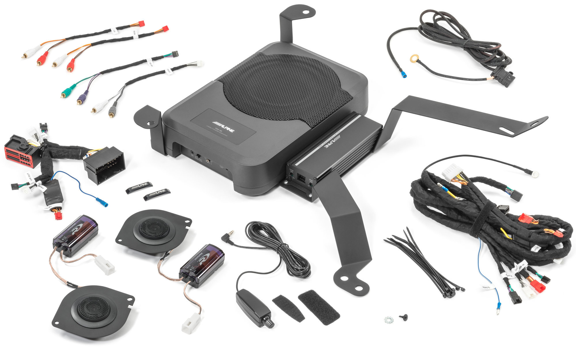Jeeps are famous for their versatility, durability, and off-road capability. Unfortunately, they are not known for their sound systems. This becomes increasingly apparent when the top is down, especially with large aftermarket tires. Find out what you are missing with the Alpine PSS-23WRA Full Sound System Upgrade. This 300 watt plug and play kit is specifically designed for the Wrangler JL and Gladiator JT. It includes a high performance 8” subwoofer with built in amplifier, a pair of 1” tweeters, and a four-channel amplifier to completely overhaul your factory sound system. The PSS-23WRA is compatible with both factory and aftermarket head units, and comes with all necessary brackets, hardware, and wiring harnesses. Since the factory speakers lack high and low-end frequency range, Alpine focused their efforts on a subwoofer and tweeters.