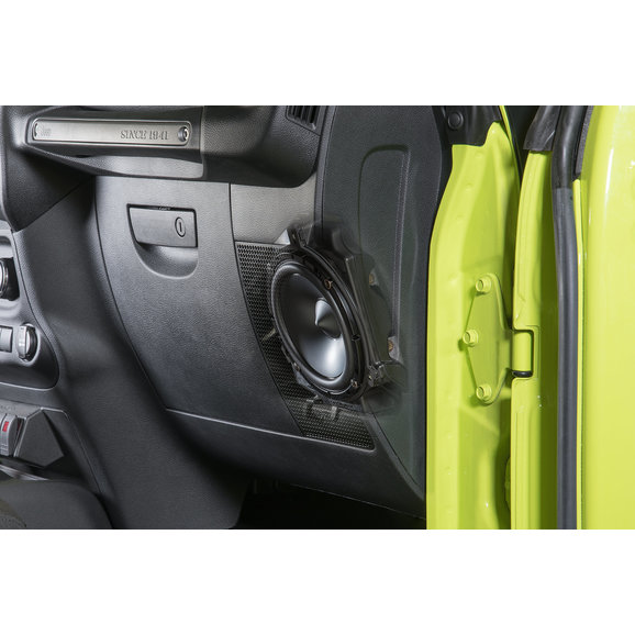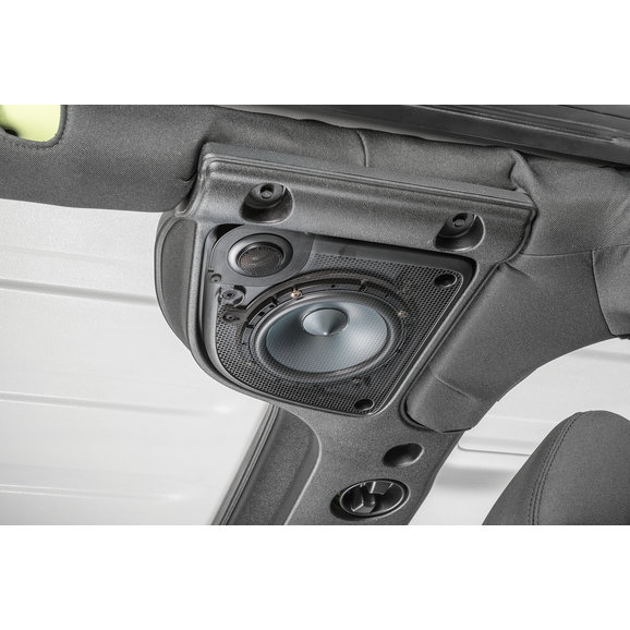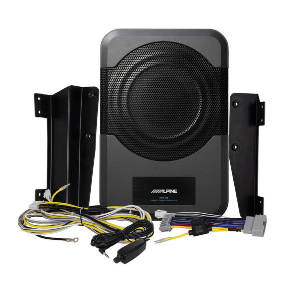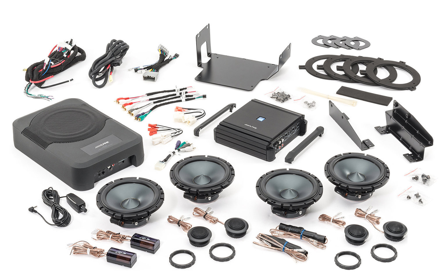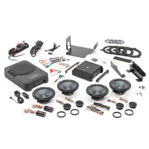 Jeep Wrangler owners Rejoice! Now you can enjoy huge sound performance even with the top off! The all new Alpine PSS-21WRA sound system is a 10 component custom engineered kit for the ’15 and newer Jeep Wrangler 4-Door JK to solve the audio performance problems associated with open air driving. By loading the lower frequency sound into the passenger’s foot well area, Alpine’s system delivers amazing sound quality with maximized bass extension whether the top is on or off. The 120-watt system consists of a PWE-S8 powered subwoofer with custom mounting brackets that neatly mount the sub under the driver seat. Kits also include a pair of SPT-70 6.5” 2-way speakers with separate 1” silk dome tweeters for the dash, pair of SPT-71 6.5” 2-way speakers with separate 1” premium silk dome tweeters for the overhead sound bar, an MRV-F300 V-Power 4-channel amplifier with mounting brackets and all necessary wiring harnesses. Kit comes complete and is an easy Plug-N-Play installation that can be tackled in a few short hours. The PSS-21WRA works with any Alpine Restyle dash system, other aftermarket head units or the original equipment factory radio.