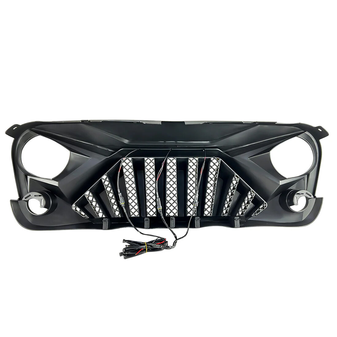 Give your Jeep Wrangler JK, JL, or Gladiator JT a bold and commanding front-end aesthetic with the American Modified Goliath Grille. This grille features a menacing “angry eye” design and optionally integrates amber LED running lights for increased visibility in low-light conditions. Constructed from high-quality ABS plastic, it is lightweight, impact-resistant, and designed to hold up under off-road conditions while still complementing daily drives with its aggressive styling.
