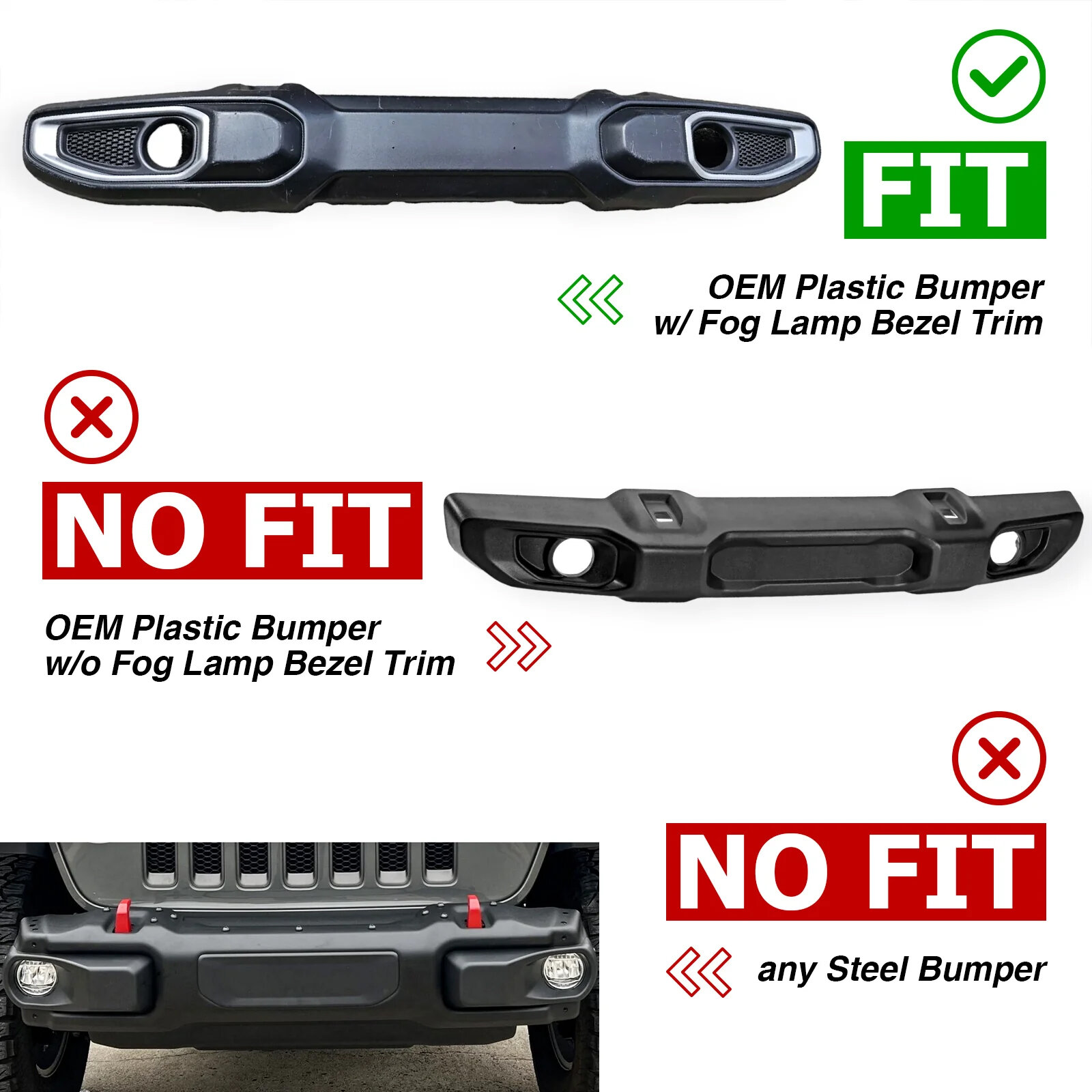 The  LED Front Bumper Fog Light Covers w/ Turn Signal  are specifically designed for Jeep Wrangler JL and Jeep Gladiator JT models that retain the OEM plastic bumper with fog lamp bezel trim. These covers combine stylish smoked lenses with built-in amber turn signals and white DRL LEDs, offering a distinct look while preserving full front lighting functions. Crafted for simple installation without cutting or modification, they replace the existing fog light bezels and bring a clean, integrated aesthetic to your front bumper.
