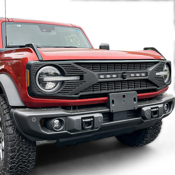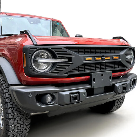 The American Modified Tomahawk Grille with Amber LED Running Lights in matte black is a bold styling choice for Ford Bronco owners who want a more aggressive and distinctive front-end appearance. Featuring sharp, angular design elements inspired by off-road performance, this grille transforms the look of your Bronco while maintaining a clean, factory-style fit. The integrated LED lights (when selected) add a striking visual signature that improves visibility and gives your vehicle a trail-ready presence both day and night.