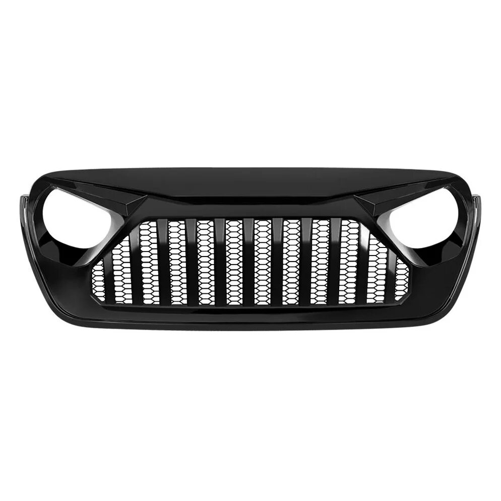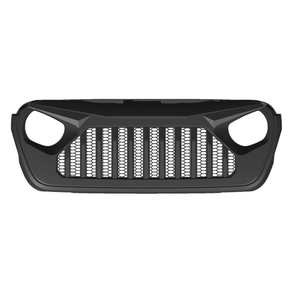 The American Modified Gladiator Vader Grille with Mesh for Wrangler JL and Gladiator JT (without TrailCam) delivers an unmistakable front-end appearance with a bold and angular design. Crafted from high-quality ABS plastic and featuring a mesh pattern for improved airflow, this grille blends aggressive aesthetics with practical form. Its matte black finish offers a clean, modern look that pairs well with a wide range of exterior colors and accessories, making it a standout upgrade for enthusiasts who want their Jeep to stand apart.