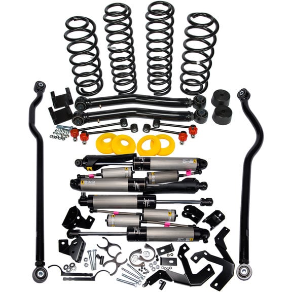 Old Man Emu BP-51 High Performance Lift Kit: This complete lift kit is designed to provide 3.5" of lift to Sport and Sahara models, or 2.5" of lift to Rubicons. The included BP-51 shocks are fully adjustable, so you can tune them to your terrain and driving style. The high-flow design, remote reservoirs, and aluminum bodies keep the shocks cool and fade free. By mounting the remote reservoir behind the headlight buckets, Old Man Emu keeps the wheel wells clear for increased suspension articulation. The lower shock mounts feature a built-in skid plate for added off-road protection.