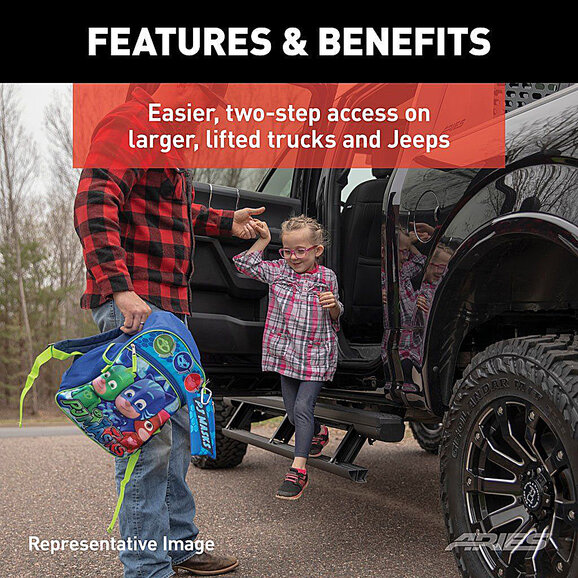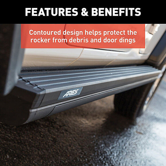 The Aries ActionTrac Powered Running Boards are designed to make getting in and out of your Bronco a breeze. The rotary motor powered step quickly and quietly deploys automatically once the door is opened for easy access. An LED light also automatically engages so you can see where you’re stepping, and the boards are equipped with sensors to detect any obstructions during operation. The contoured design is tough to protect the rocker panels and internal elements from damage while out on the trail, and the steps feature a two second delay to prevent early retraction when entering the vehicle. Installation is simple and straightforward with no drilling or wire splicing required, and these steps come backed by a Limited Lifetime Warranty for peace of mind.
