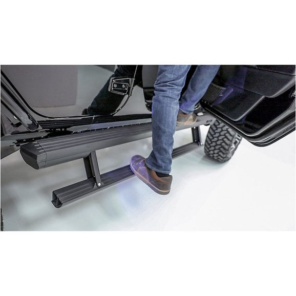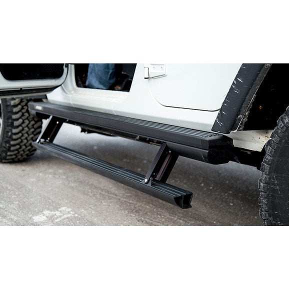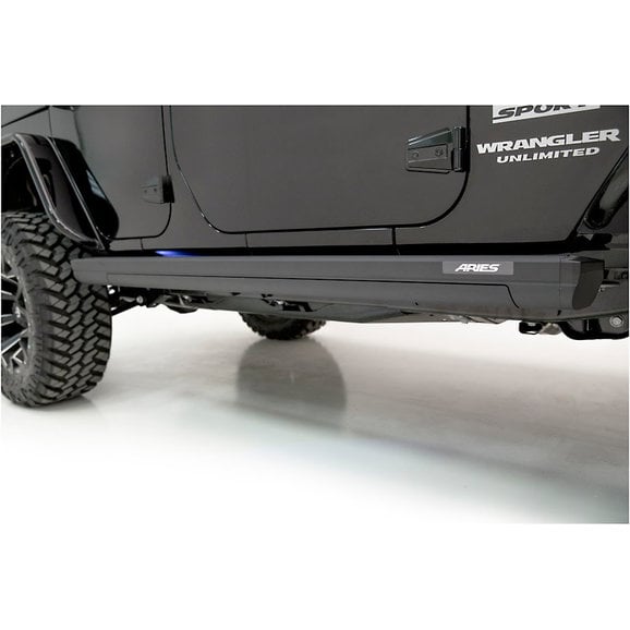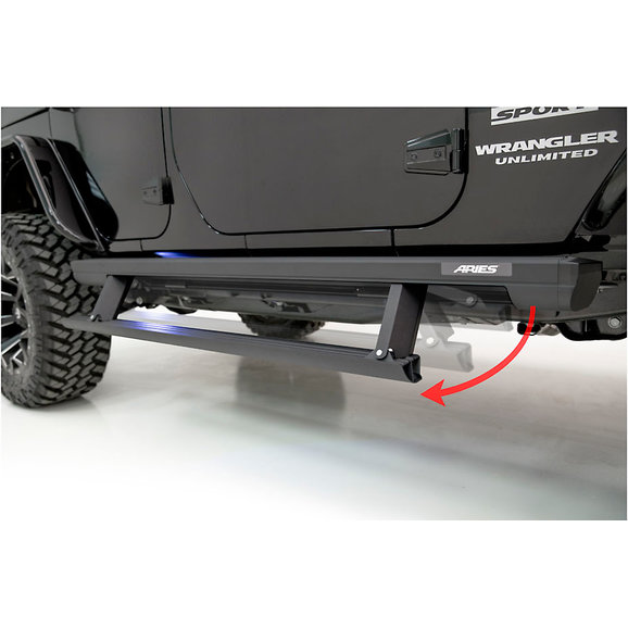The ActionTrac Powered Running Boards by Aries Automotive are designed with the off road adventure in mind. Manufactured from lightweight 6061-T6 aluminum, these running boards are very durable and non-corrosive. The unique design of the step pair is a patented step within a step application which makes entry and exit from the Wrangler JL very easy, especially with lifted vehicles. The powdered steps will automatically deploy and retract with the opening and closing of the doors. A built in LED light will operate when the steps are deployed that will light up the entire step area for safety at night. The control module for the steps can detect any obstructions that may be in the way which will prevent any potential injures while the steps deploy or retract. A switch is also included that allows manual control of the steps if you take the doors off the Jeep. Finished with a durable carbide black powder coating, these steps will offer the maximum corrosion protection that is available. All of the necessary hardware and wiring is included which makes for a hassle free installation with no drilling or modifications to the vehicle. The ActionTrack Running Boards are made specifically for the Wrangler JL 4 Door.
