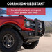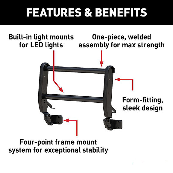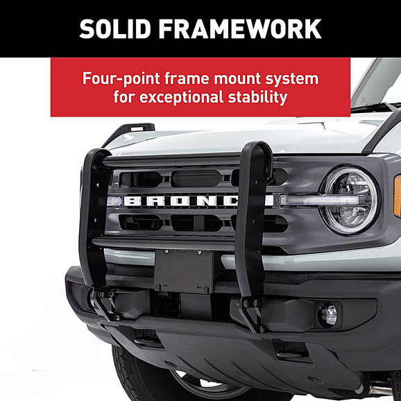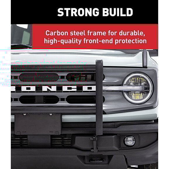 The Aries ForeFront Bronco Bull Bar provides the ultimate upgrade specifically for the Bronco with its unique features and protective build. The carbon steel frame construction delivers premium front-end protection and features a tight, sleek design that complements the lines of the vehicle for a streamlined appearance and finish. The ForeFront bull bar is assembled as one fully welded piece with a four-point frame mount system that ensures maximum stability and strength. In addition to its distinctive design and protective structure, the ForeFront includes built-in light mounts for aftermarket LED lights and integrated tow hooks to ultimately enhance the Bronco experience. It is finished with an E-coat and semi-gloss black powder coating for superior corrosion resistance that lasts through every journey, trip, and adventure that awaits.