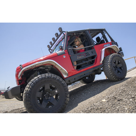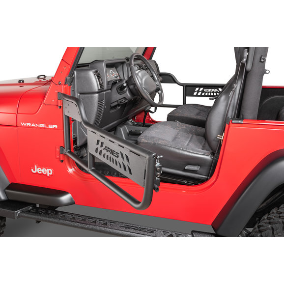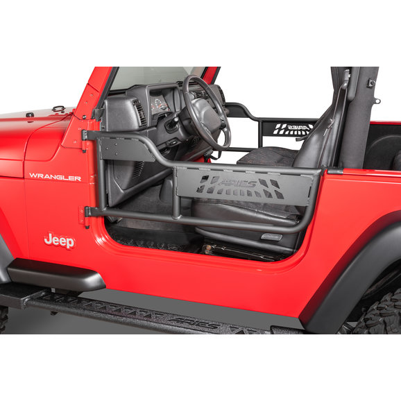 Features: These doors come with a swing out strap to ensure your doors do not swing open too far as well as pre drilled holes for mounting mirrors to them to keep you legal & safe (not compatible with power mirrors). A durable textured black powder coat finish gives you the ultimate protection against rust & UV damage. TIG welded for exact fit on your Wrangler TJ