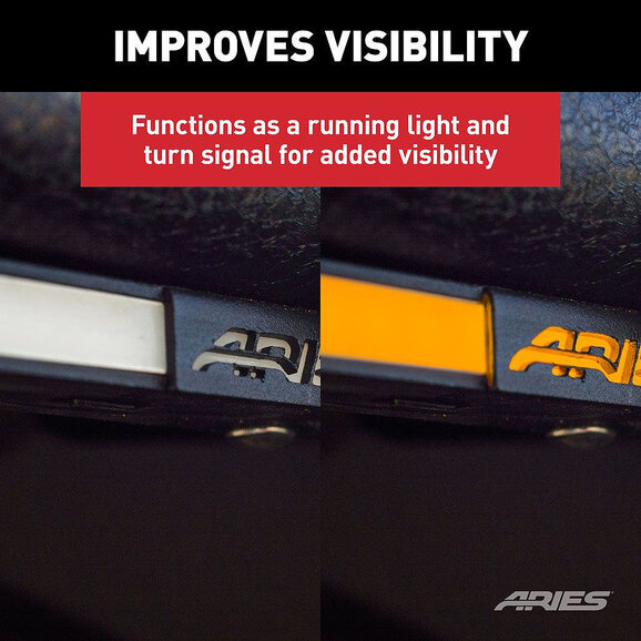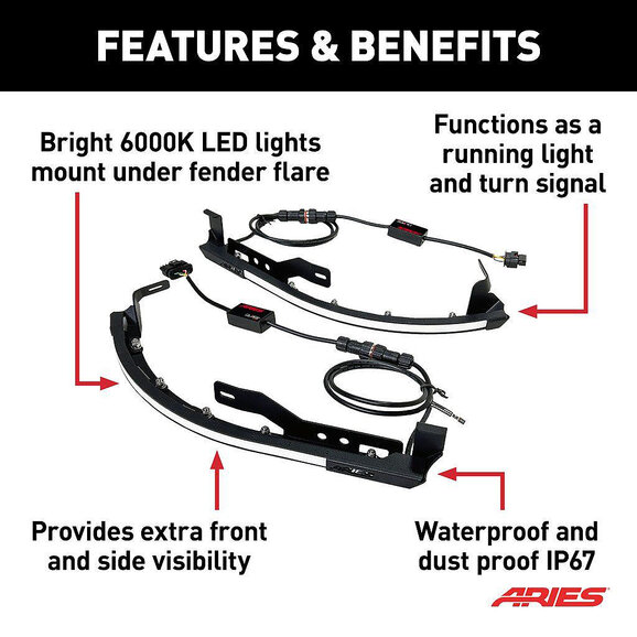 The ARIES Fender Flare Lights add bold and distinct style to your Jeep Wrangler JL or Gladiator JT. The bright, ultra-white 6000K LED lights are designed to function as running lights and turn signals, while highlighting your fender flares and body lines, giving your rig an aggressive and bold look that turns heads. These promote safety by providing extra visibility from the front and sides.
