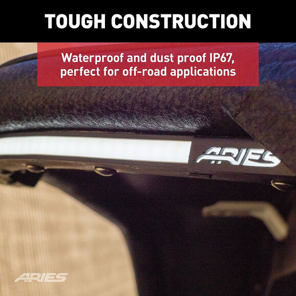 ARIES Fender Flare Lights are constructed to take on the trail with IP67 which means they are dustproof and waterproof up to one meter. They are ready for whatever you take your Jeep through, whether that be down intensely dusty trails or through mud, water, snow, or ice. They're built to withstand the elements and adventures that lie ahead. These fender flare lights are built to last.