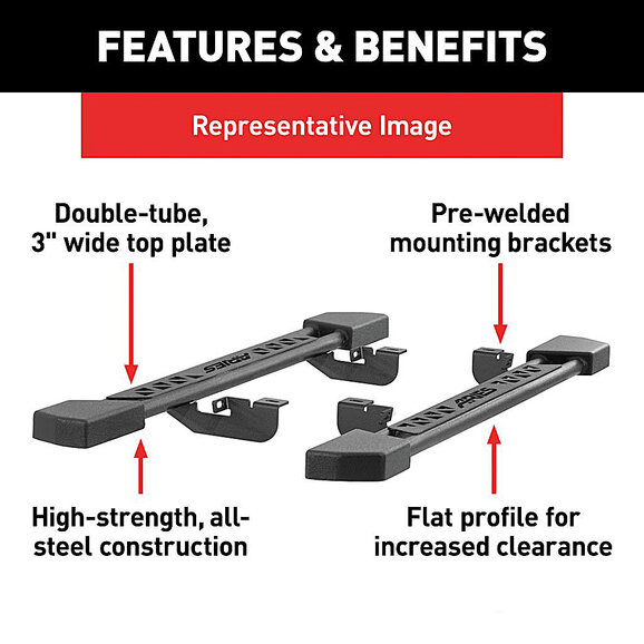 Superior Clearance: Steps mount high and tight to vehicle side, providing plenty of ability to pass over rocks, logs and other trail obstacles without damage.