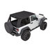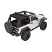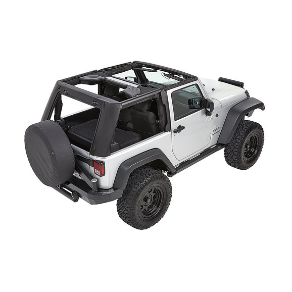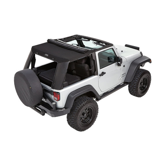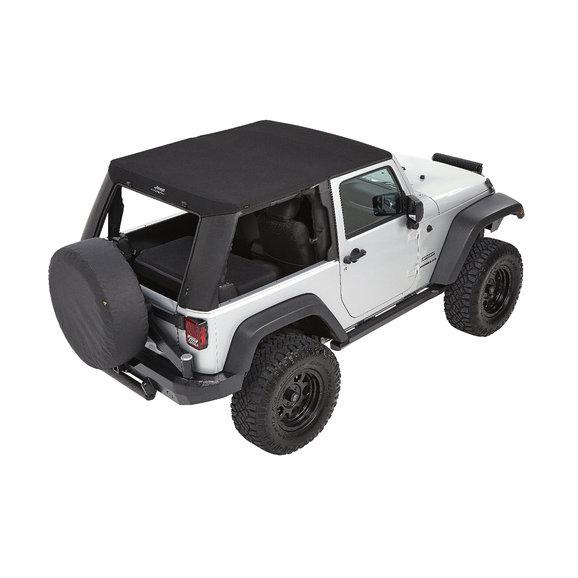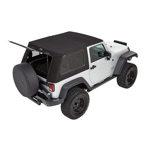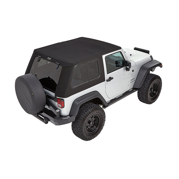 Bestop's Trektop Pro Soft Top for the 2007-18 Two-Door Jeep Wrangler JK is an innovative all-season top solution that offers an industry-first rear glass hatch and ultra-durable 30 oz. triple-layer black twill fabric. This top's front Sunrider panel can be quickly folded back for open-air driving, while its rear glass panel features an easy, one-handed operation that allows for faster cargo area access. Side windows are designed to slide, providing additional interior ventilation, or can be entirely removed to enhance an open-cabin experience. Rugged, burly black twill material stands up to the elements all season long and is specially engineered to give a no-wrinkle appearance. Display your passion by having a Jeep logo’d soft top with a mountain scene prominently shown high on the back in the center of the top. Includes all hardware for installation.