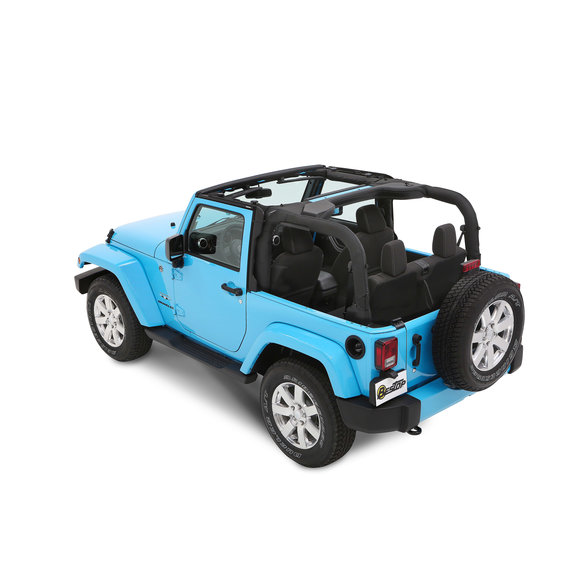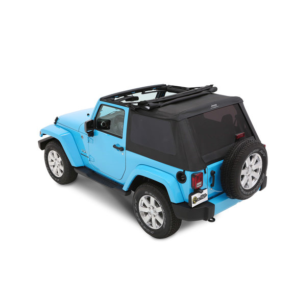 The Bestop 2 Door JEEP Trektop Soft Top Provides that sleek, clean, fast-back look to your Jeep. As a fully enclosed top with the side and rear windows the Trektop provides the ultimate in protection from the elements while out on your adventures or running to the store. Remove the windows to allow you to experience that great feeling of being in the outdoors with the wind in your hair. The Trektop offers convenience with zippered pockets above the driver and passenger for the organization of small items. Zipper-less technology allows for an improved fit and easier installation. Use of the tailgate bar and clips allows for factory style opening of the tailgate. Display your passion by having a Jeep logo’d soft top with a mountain scene prominently shown high on the back in the center of the top.