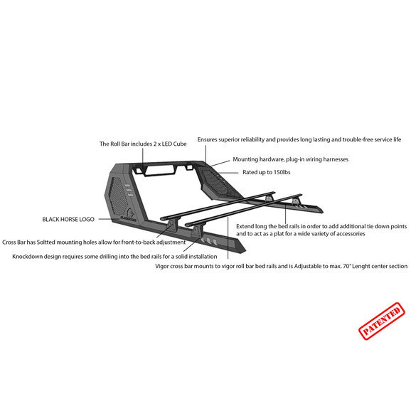 The Black Horse Off Road Vigor Roll Bar With Cross Bar for Jeep Gladiator JT models gives a great sporty look to your truck. The roll bar extends along the bed rails in order to add additional tie-down points and to act as a platform for a wide variety of accessories. The Vigor cross bar mounts to Vigor Roll Bar bed rails and is adjustable to the maximum of 70" length center section for even more versatility. To increase the storage and functionality, the cross bar has slotted mounting holes that allow for front-to-back adjustment. These roll bars are engineered using cold-rolled steel construction and are powder-coated over an E-coated corrosion inhibiter. The roll bar Includes two integrated LED cube work lights to illuminate the bed. Roll Bar is rated up to 150lbs. Installation does requires some drilling into the bed rails for mounting hardware, and plug-in wiring harnesses.