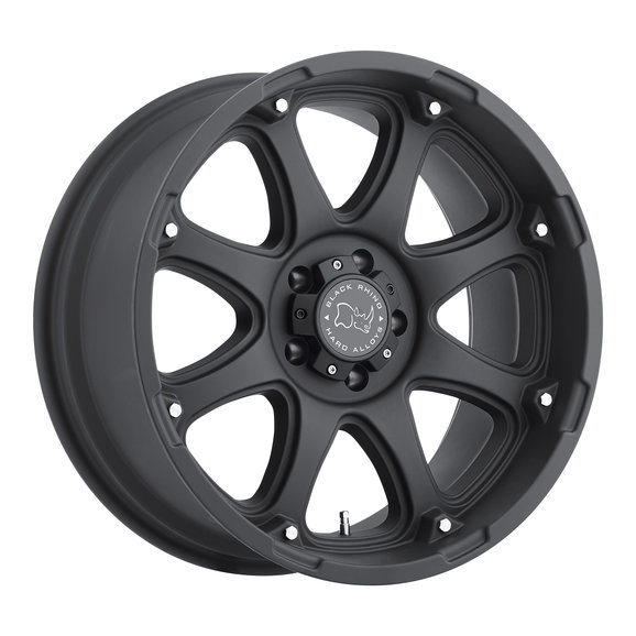 The GLAMIS wheel by Black Rhino is a sturdy eight spoke style. Each spoke jumps out to a healthy lip accented by heavy duty stainless steel hex bolts. The GLAMIS wheel is available in aggressive standard fitments such as 17x9” with a 5x5 bolt pattern and 4.5in Back Space. The GLAMIS is available in a Solid Matte Black. Each Black Rhino wheel is engineered to carry the heavy loads often associated with today’s Jeeps and all wheels are either hub-centric or supplied with centering rings to ensure a smooth vibration free ride.