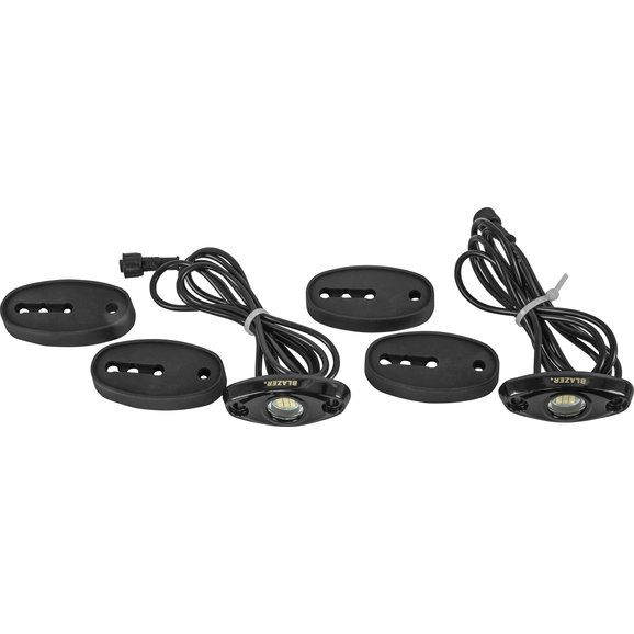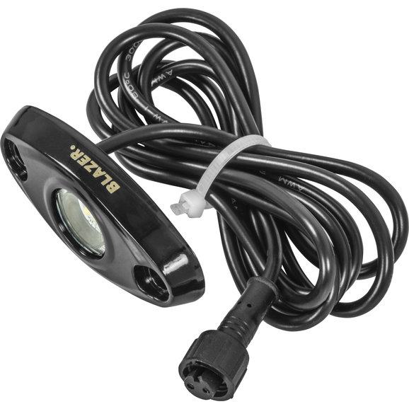 The Blazer International LED White Rock Lights 4 pack kit enhances and customizes your night crawling or showing off experience. The versatile lights can be placed anywhere for specific extra lighting. The kit includes flat or curved grommets for easy installation on any surface. The flat grommets work well for flat surfaces such as inner fender liners and frame rails and the curved will work on rounder surfaces like cross bars. Each light has 9 individual LEDs that provide up to 30,000 hours of light, a significant increase over traditional incandescent lights. These draw significantly less power than traditional halogen bulbs at only 1 watt. The polycarbonate housing resists corrosion and will last in all weather conditions. Installation is easy with a quick-connecting system that allows for plug and play installation.