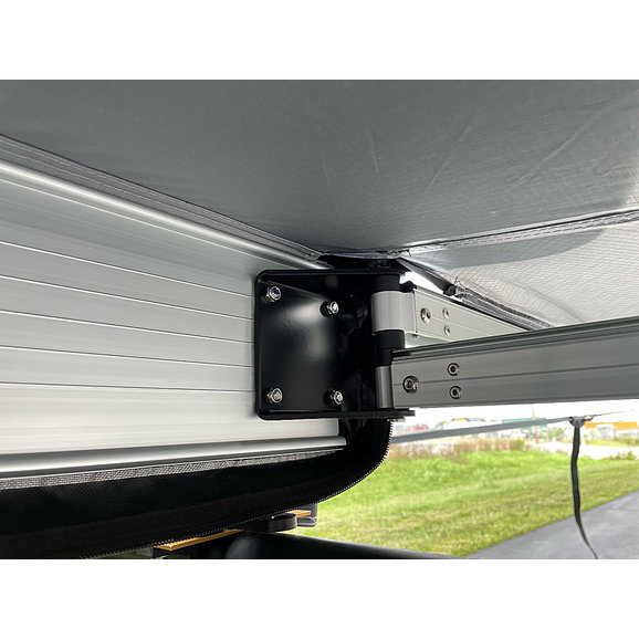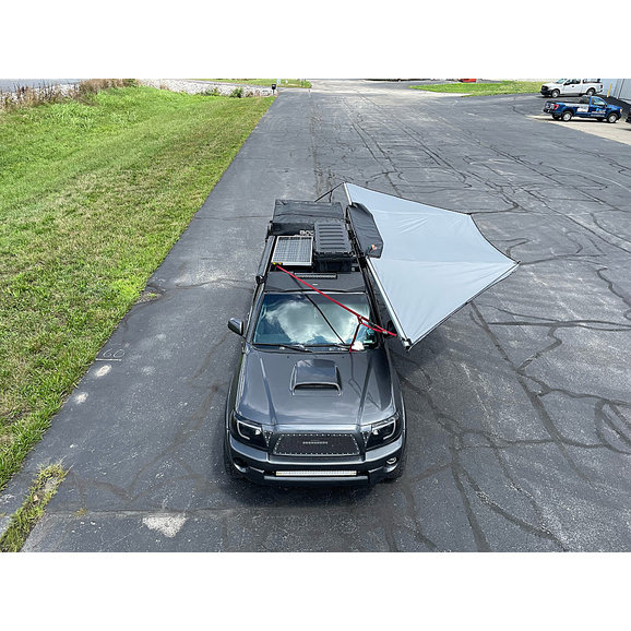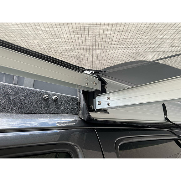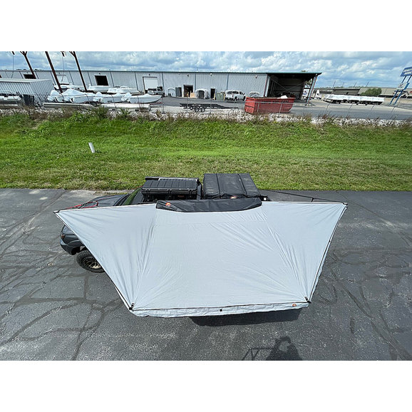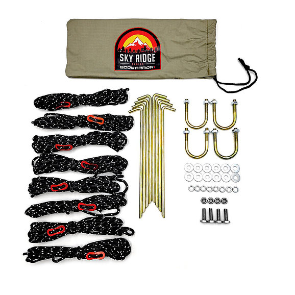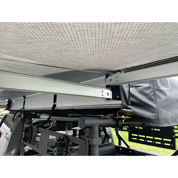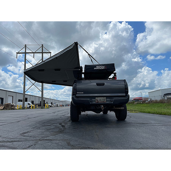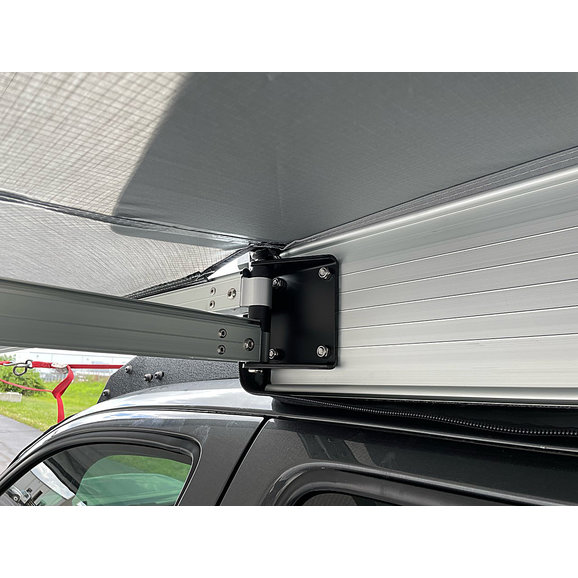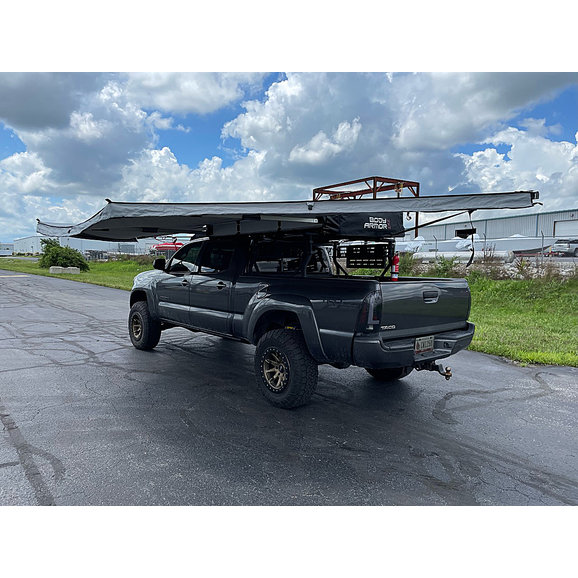 The Body Armor Sky Ridge 180XL Awning with Mounting Brackets is an excellent way to enjoy outdoor activities without being exposed to the elements. This awning easily mounts to virtually any roof rack or bed rack and provides 88 square feet of covered space for shade, lounging, cooking, or a host of other tasks. The self-contained unit includes rugged, lightweight extruded aluminum with alloy hinges and telescopic legs with twist-lock fixtures, while its heavy-duty travel cover is engineered from sturdy, UV-resistant 1000g PVC coated tarpaulin material with heavy-duty zippers. Legs telescope from a minimum of 55" to maximum of 102". The awning also includes stakes and tie-down straps for use in windy or inclement conditions. Features a two-year finish and limited lifetime warranty from manufacturer's defects.