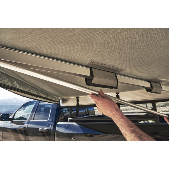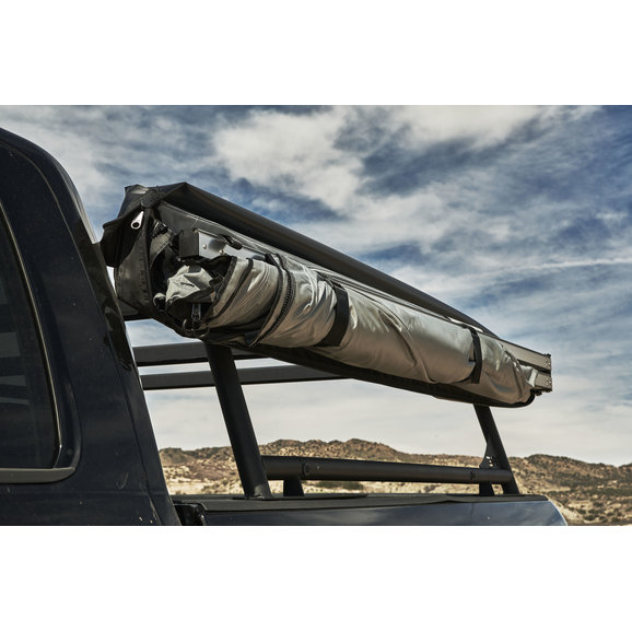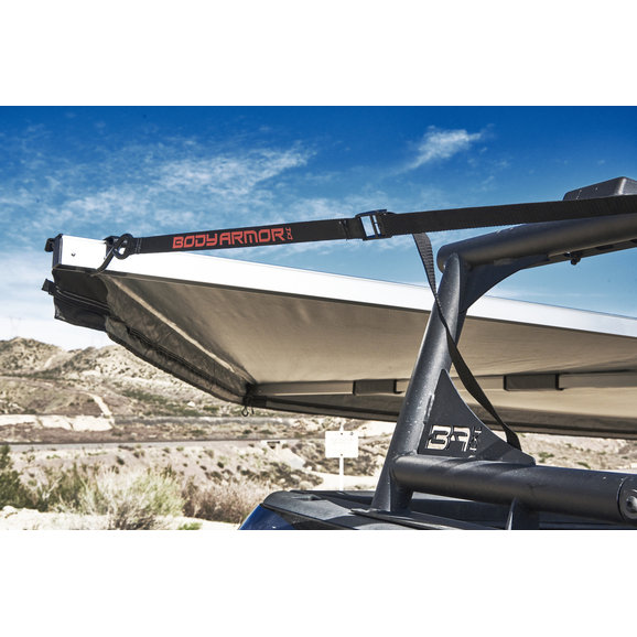 The Sky Ridge 270 Awning from Body Armor provides you with 80 square feet of shaded covered space the next time you are out camping or enjoying a day at the beach. This awning easily attaches to most Jeep roof racks & Gladiator bed racks making set up or tear down an quick & easy one person job. Made from 420D Ripstop Polyester Oxford fabric that is polyurethane coated for 2500mm waterproofing to keep you dry in case it starts to rain & it comes with a heavy duty travel cover made of UV resistant 1000G PVC coated tarpaulin material with heavy duty zippers to store when not in use. This self contained awning includes rugged, light-weight extruded aluminum telescopic legs and arms, with twist-lock fixtures & comes with stakes & tie down straps to secure your awning in windy weather. Choose between driver or passenger side awnings.