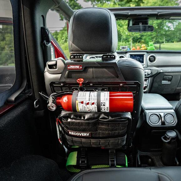 Builtright Industries LLC Seat Back Tech Plate MOLLE Kit for Jeep Wrangler JL & Gladiator JT turns unused seat-back space into a secure, rattle-free organization system for your Jeep. Built from extremely durable 11-gauge steel, this laser-cut and CNC-formed Tech Plate delivers a precise fit and a robust mounting surface for MOLLE/PALS-compatible gear, pouches, and accessories.