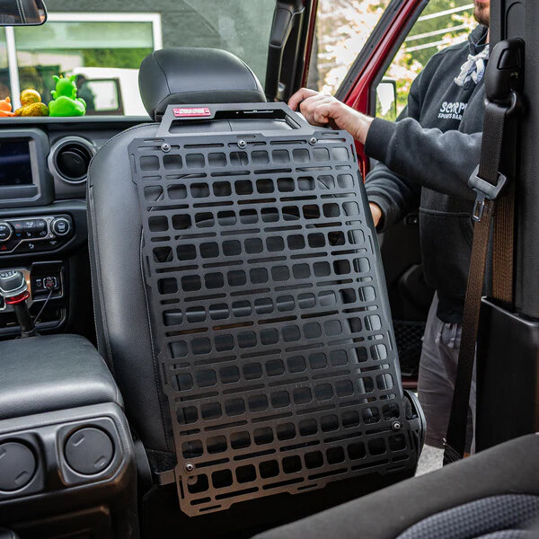Unlike strap-based panels that can shift, wear seats, or loosen over time, this kit uses a patented rigid mounting design with upper and lower steel brackets plus machined aluminum headrest loop brackets. The result is a solid, confidence-inspiring install that keeps equipment where you put it and still allows the seat to recline without interference. A corrosion-resistant black texture powdercoat finish completes the premium look while helping protect against the elements. Designed for Jeep Wrangler JL and Gladiator JT models, this seat back MOLLE panel kit includes everything needed to outfit one seat with a 16.0 x 23.5 inch Tech Plate and hardware. Note: it will not fit Rubicon seats with the hard plastic seat back cover.- 1x 16.0 x 23.5 Tech Plate