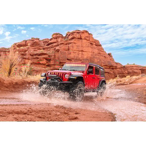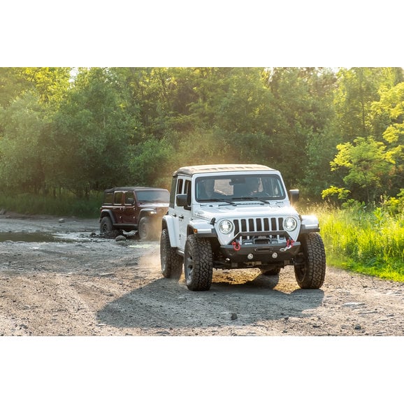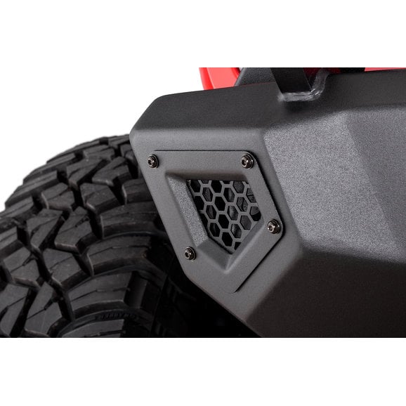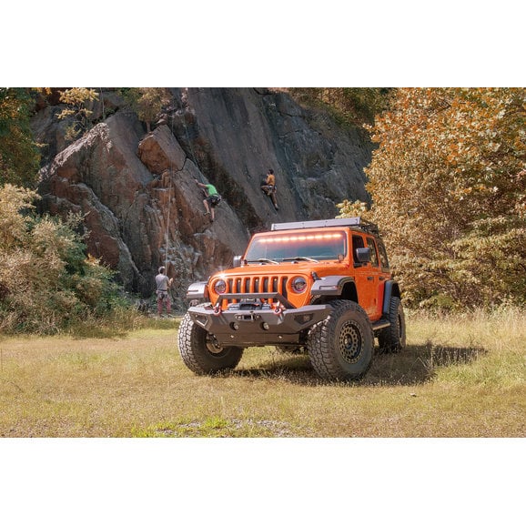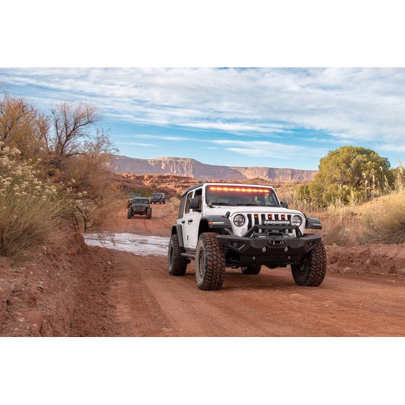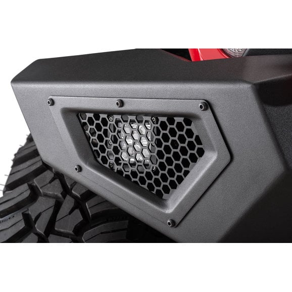 Speaking of lighting. In addition to the mesh stone guards, guards on the mid- and full-width bumpers, there are integrated fog light holes and 3" cube light holes that accepts the factory fog lights or auxiliary cube lights. The removable, stylish over-rider bar is slotted across the top for use with auxiliary lighting including light bars or cubes to illuminate the entire trail for better visibility in dark conditions.