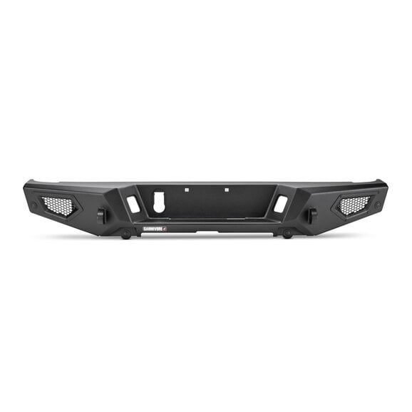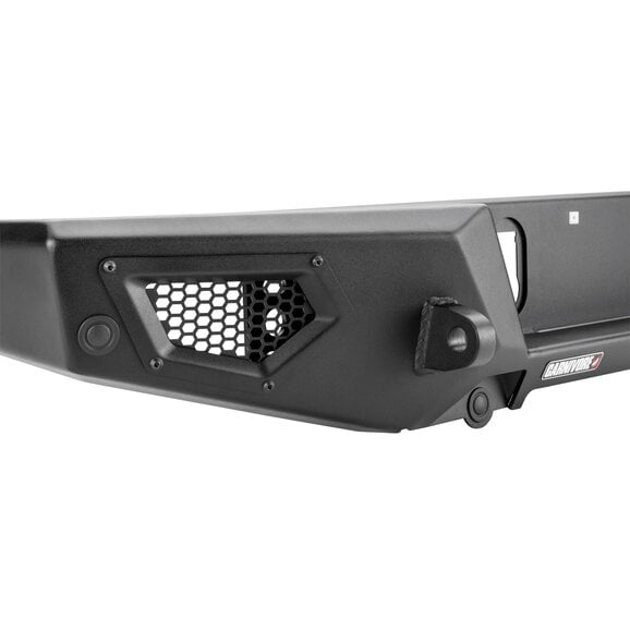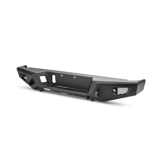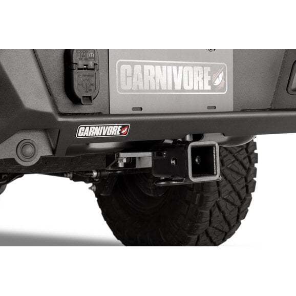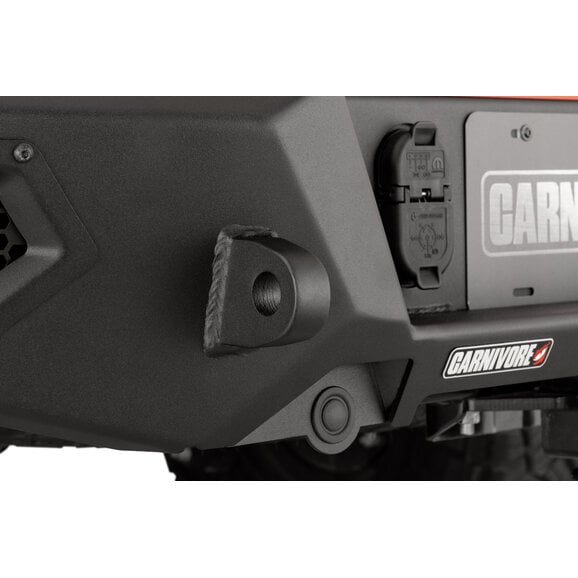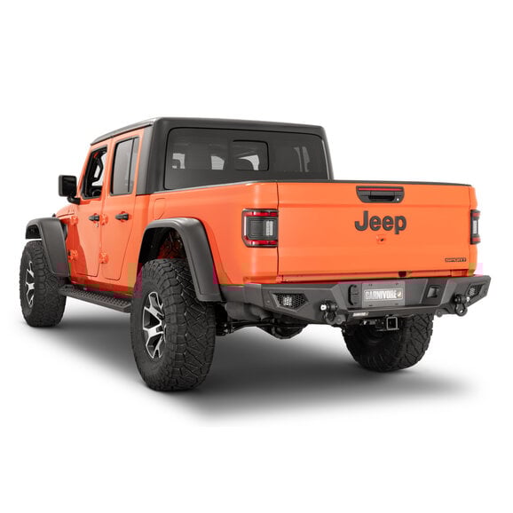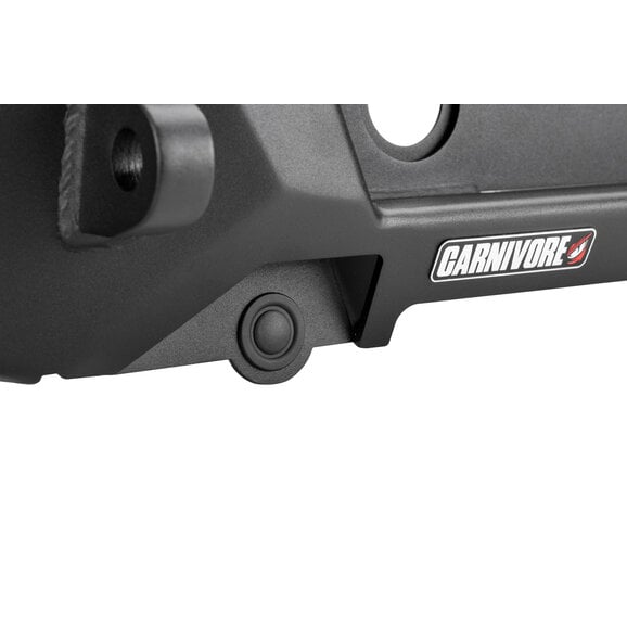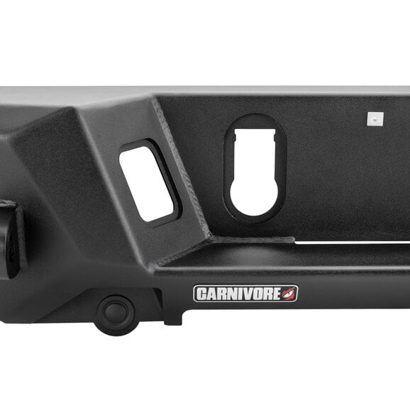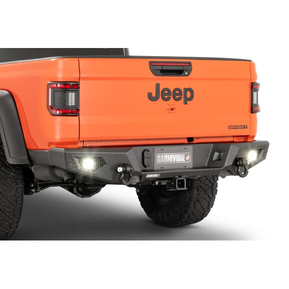 Carnivore's Rear Bumper is specifically engineered for 2020-24 Jeep Gladiator JT models, and dynamically protects the vehicle from all types of trail conditions with its unique styling sure to turn heads. This heavy-duty steel rear bumper solution is laser-cut from 5mm thick carbon steel plating and includes 6mm thick frame mount brackets robotically welded for precision and strength. Measures 65 inches wide, and accommodates the factory rear backup sensors if equipped. as well as fitment for up to a 35” tall spare using the factory spare tire mount. The rear backup light mount brackets are cleverly concealed and allow for 3" auxiliary lights behind stylized mesh stone guards — giving an aggressive off-road appearance. (Lights sold separately). This bumper is designed to work with factory and aftermarket tow hitches, and includes a license plate mounting bracket with led lights and a plug-and-play wiring harness. The 1" thick D-Ring clevis tabs provide two functional recovery points, while a black textured powder coating provides lasting durability and superior corrosion resistance. Easy direct bolt-on installation does not require any drilling or modification.