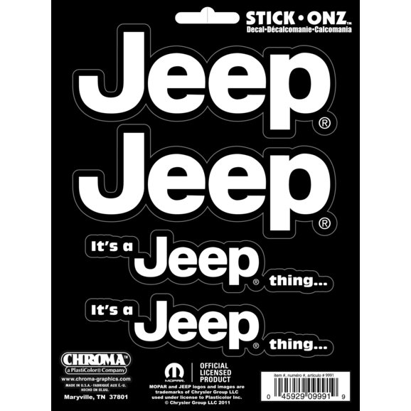 The It's a Jeep Thing with Jeep logo Sitck Onz Decal set is a great way to show off your Jeep pride. The decal set comes in white and is self adhesive, making the install simple. Includes four decals.