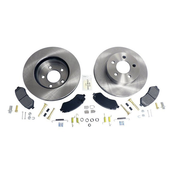 The Crown Automotive Front Disc Brake Service Kit for 02-07 Jeep Liberty KJ provides factory replacements for repairing the front disc brakes on your Jeep. These disc brakes are constructed from rubber and steel with an unpainted finish. This kit includes the rotors, brake pads, pad springs, caliper pins and caliper pin boots. The Disc brake kit is Backed by Crown's 12 month warranty.