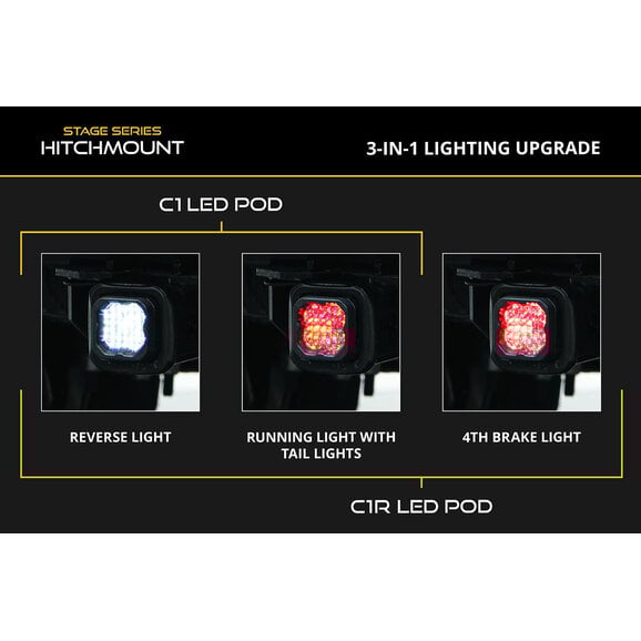 Add significantly more light output when backing up at night with Diode Dynamics Stage Series HitchMount Reverse Light Kit! This kit allows you to mount one SSC1 or C1R LED pod in your 2-inch trailer hitch receiver, adding a high-power reverse light, additional running light, and an optional 4th brake light with the C1R option. With the included wiring harness, this kit connects to your vehicle's factory trailer hitch wiring for simple, everyday operation. This kit is completely plug-and-play with all 7-pin trailer connectors. The included harness plugs right into your factory trailer hitch wiring for easy installation and operation. The kit operates as an additional red running light with your tail lights, and then automatically switches to a high-power backup light when your vehicle is in reverse.