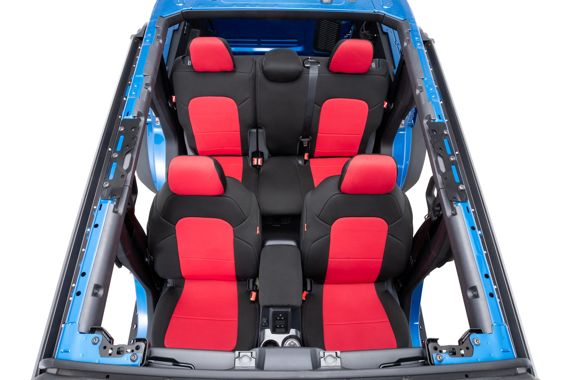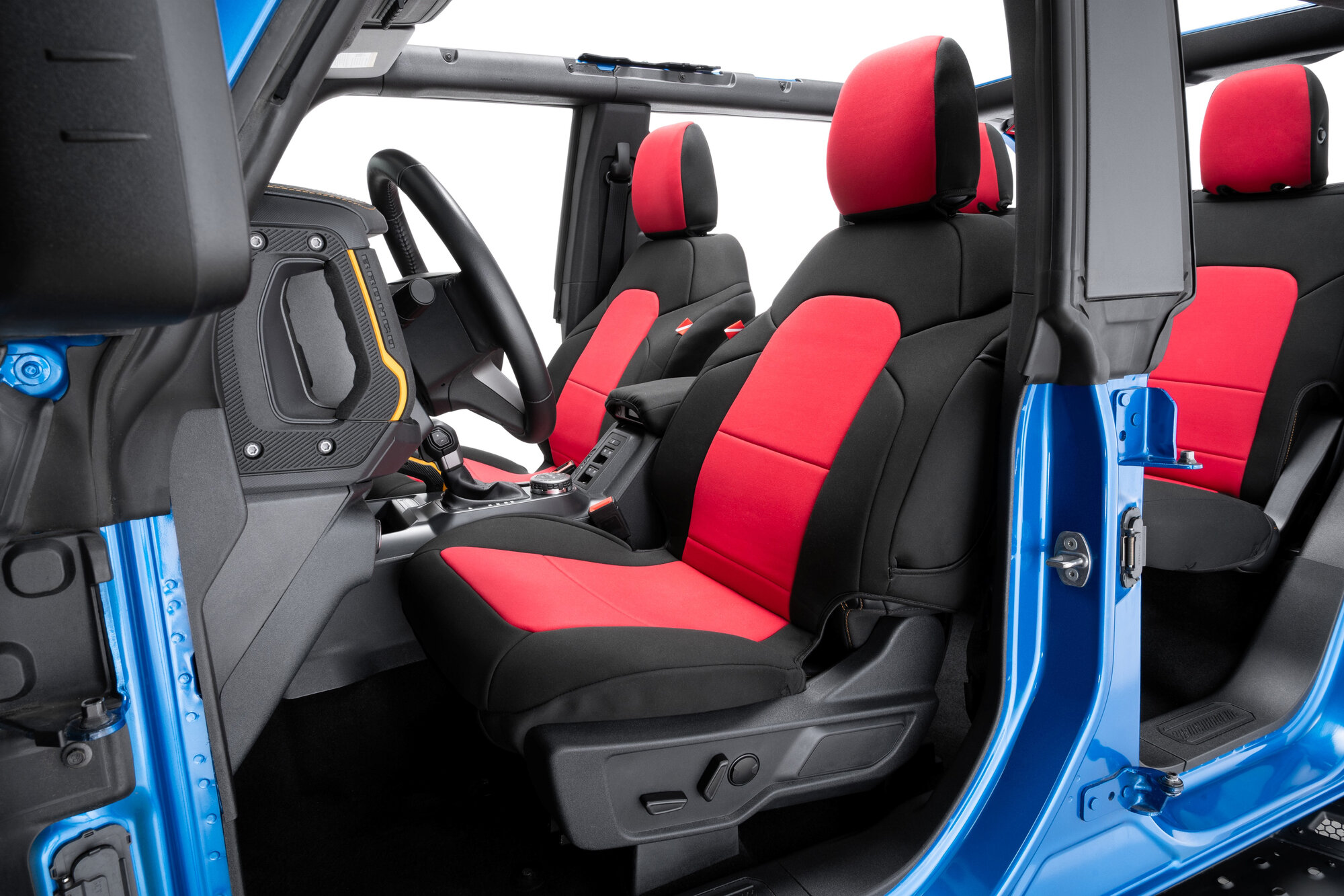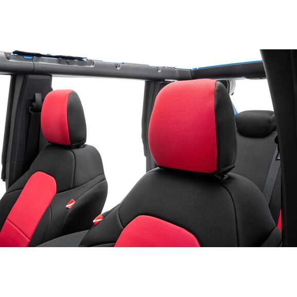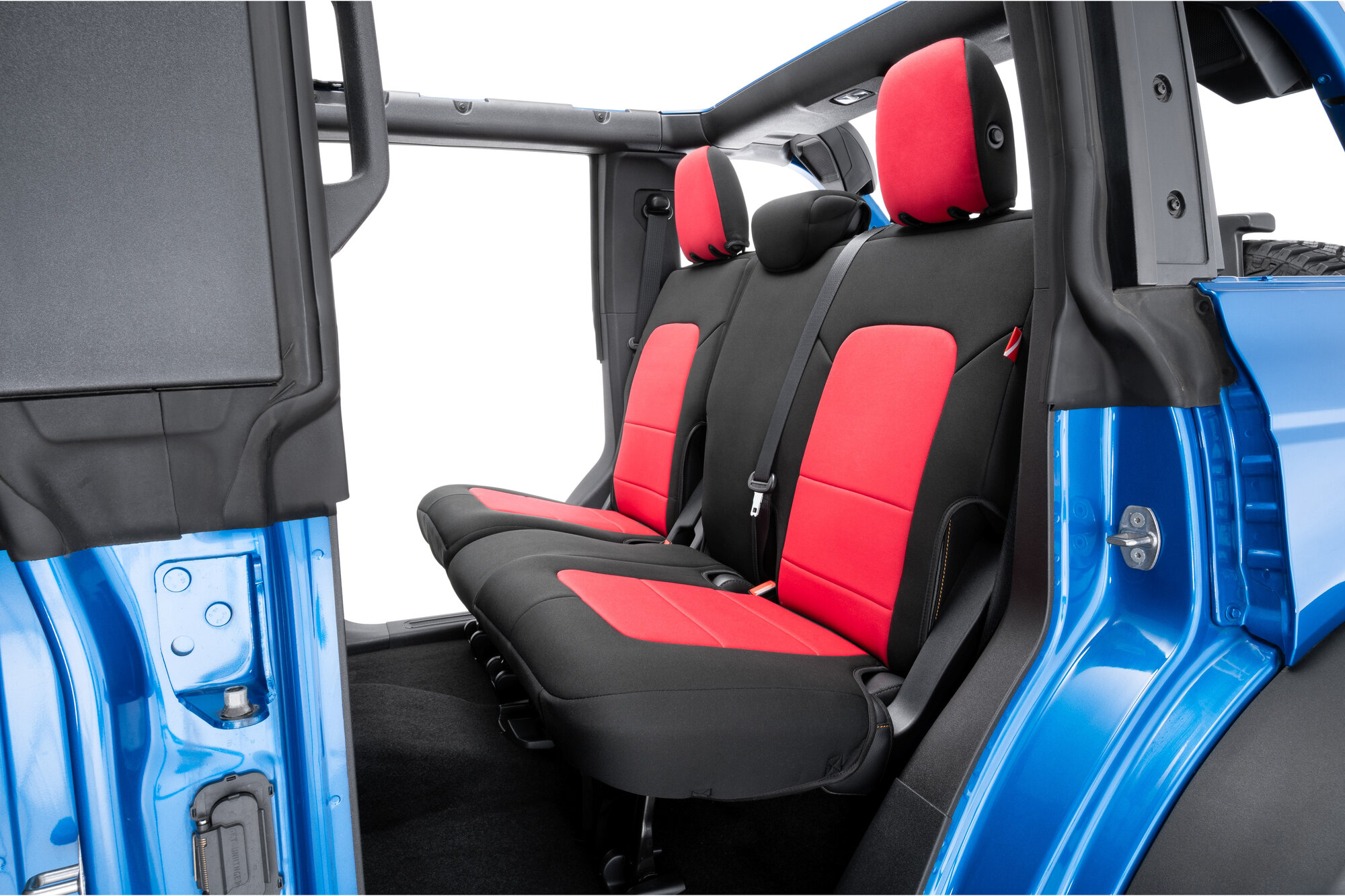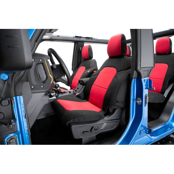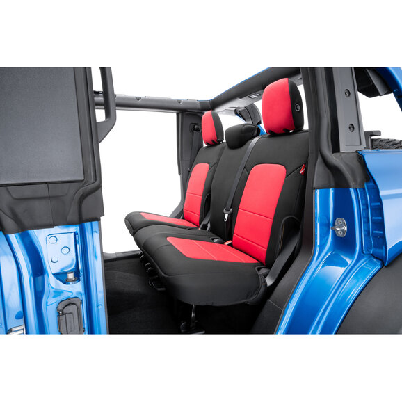 Constructed from genuine automotive-grade neoprene, these Bronco seat covers provide a comfortable, cushioned feel along with excellent temperature resistance to help keep seats cooler in hot weather and warmer during colder months. The design features sleek black neoprene on the backs and sides, complemented by multiple color panel options to give your Bronco a personalized touch. Each complete kit includes front and rear seat covers plus matching headrest covers for a uniform look throughout the cabin. With integrated storage pockets on the front seatbacks and secure attachment using straps, buckles, elastic, and hook-and-loop fasteners, these covers offer dependable fitment and long-lasting performance for active Bronco owners.