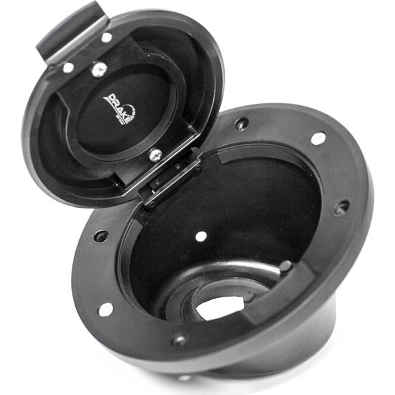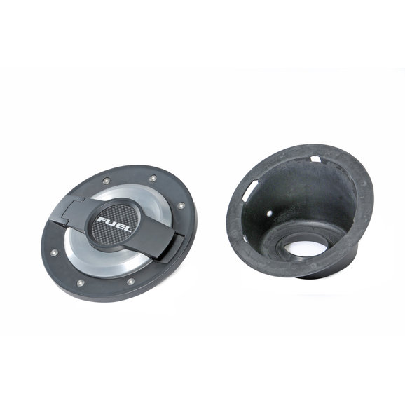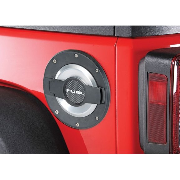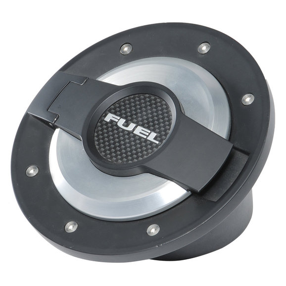 This high quality Jeep Wrangler JK Fuel Door is made from die cast aluminum with a black satin finish and stainless steel accent screws. The billet center door features a carbon fiber pattern emblem detailing "FUEL" in raised satin letters. Includes complete filler collar assembly and neck gasket.