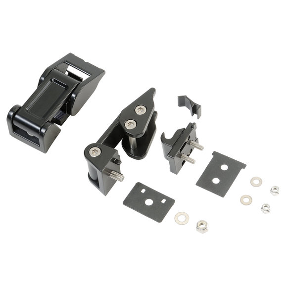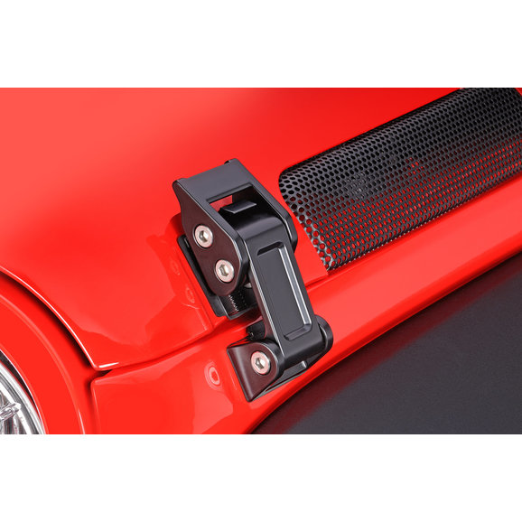 Get added style and strength for Jeep JK's with the Drake Off Road RocKlaw Hood Catch System. The rigid die-cast construction of this system virtually eliminates the "hood flutter" JK's are known for and will never stretch or deteriorate like the factory units. Many aftermarket hood latches claim to be rugged but are clunky and unfinished in appearance. These feature the innovative RocKlaw height adjustable system which allows for precise and secure setting of the hood position. They also have a customizable "style window" for installation of optional aluminum inserts for a more hardcore look. The complete latch mechanism is finished a UV resistant semi-gloss black power coating for maximum durability. High quality stainless steel hardware is included.