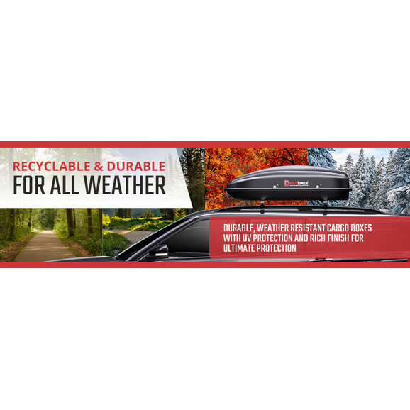 The DuraLiner Rooftop Cargo Carrier is a waterproof, hard-shell roof-top storage solution designed for Jeeps, trucks, and SUVs that need extra gear room without sacrificing interior space. With a generous 10 cubic feet of capacity, this carrier provides secure storage for luggage, camping supplies, and outdoor equipment on long trips or weekend adventures. Built to mount easily to most roof racks or crossbars, it keeps your cargo dry and secure in changing weather conditions — from rainstorms to dusty trails.