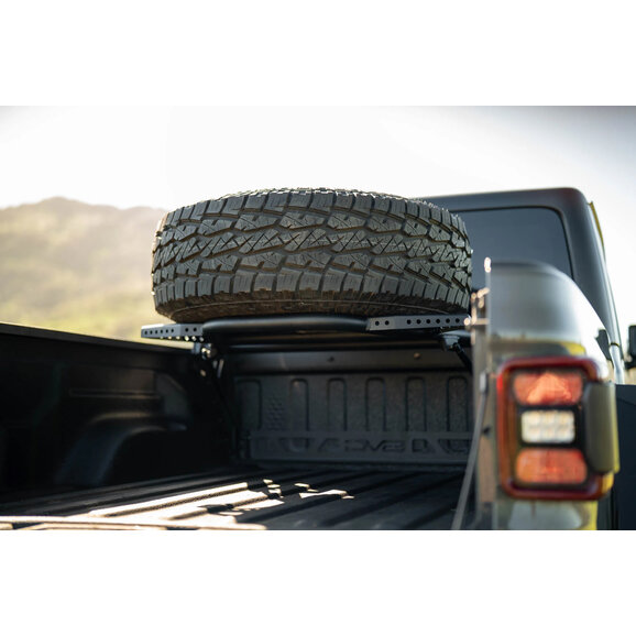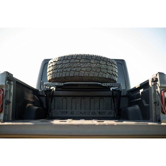 The DV8 Offroad Adjustable In-Bed Spare Tire Carrier gives you an efficient and secure way to mount your spare tire without compromising bed space or trail performance. Designed for serious off-roaders and overlanders, this tire carrier offers an ideal solution for mounting up to a 42" spare tire securely within the truck bed—without sacrificing style or utility. Its adjustable mounting angles (flat or 45 degrees) allow you to tailor the setup to your cargo needs, freeing up space underneath for additional gear or recovery equipment. Constructed from heavy-duty steel and finished with a durable powder coat, this carrier is built to withstand the toughest trails while adding an aggressive, custom look to your Gladiator.