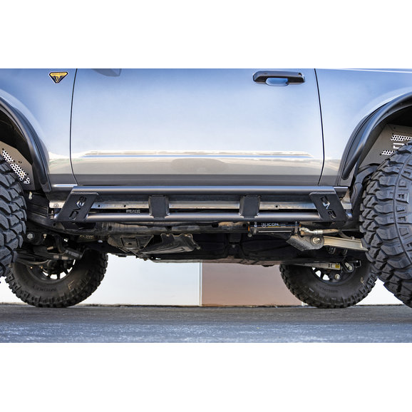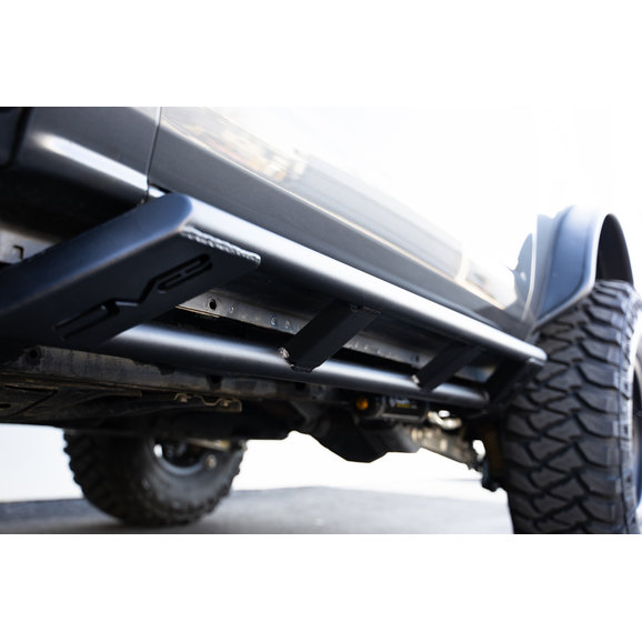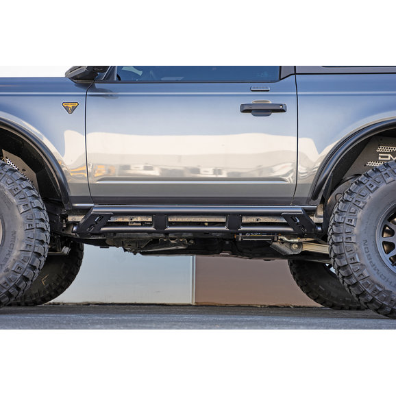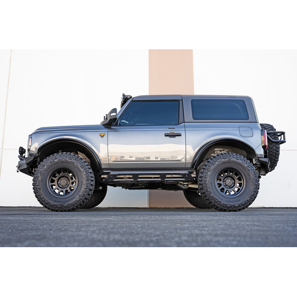 Hit those tougher trails with confidence with the DV8 FS-15 Series Rock Sliders for the 2-Door Bronco. These were built for those who push their rig to the max off-road. These will protect the sides of your ride from large rocks and other obstacles on the trail. The rock sliders serve as a more robust replacement for the available factory steel rail. The tubes are constructed from 3.5mm steel & the plates are made from 4mm steel, ensuring they can take a hit where it counts. These tubular sliders mount directly to the frame using factory hardware, providing maximum rigidity, and preventing damage or bending to the steel side body panels. They come finished in a Micro-Texture Black Powder Coat to match factory trim and prevent rust. These will clear up to 38-inch tires.