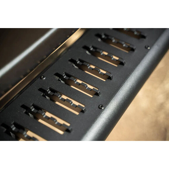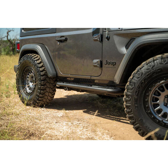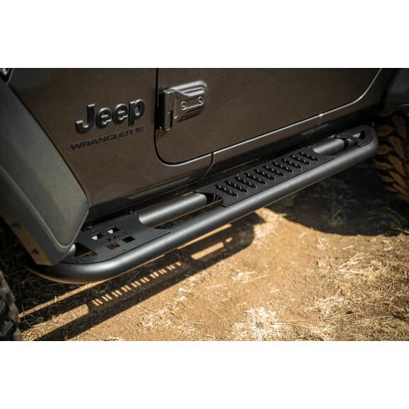 Conquer any obstacle with the confidence and protection of the DV8 Offroad OE Plus Side Steps. These heavy-duty sliders are meticulously crafted to shield your Jeep Wrangler JL 2-Door from off-road hazards, keeping you safe and stylish on the trails, and constructed from steel plates and tubing to provide a strong and durable step without compromising your Jeep's clearance on the trails. Finished with a micro-texture powder coat for additional resistance from corrosion and scratches, and an anti-slip design for safe stepping. All this is backed by their 1-year warranty for added peace of mind.