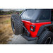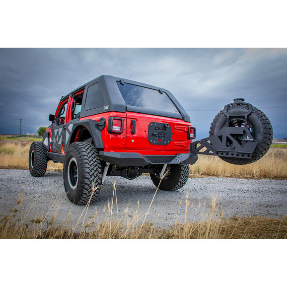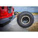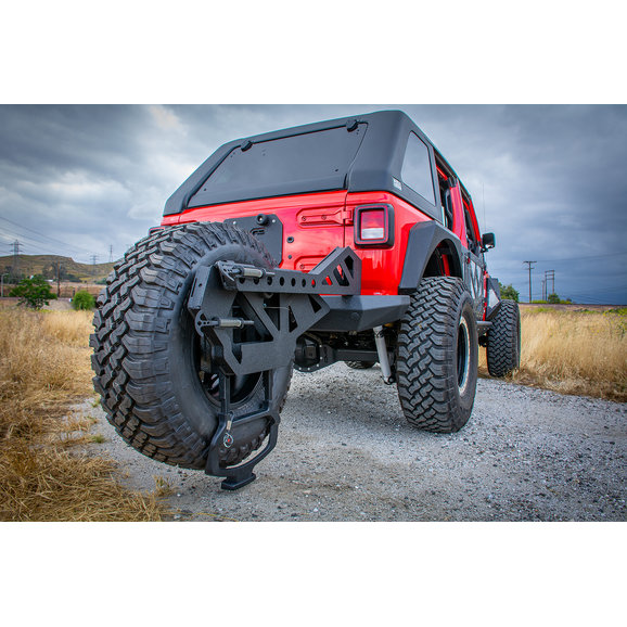 Tire Carrier: This frame mounted tire carrier accommodates up to a 42" spare tire as well as your back up camera. With pivot and pull pin action you are able to drop the tire down to the ground making it easier for you to access it if you ever need to swap out a tire on the trails or the road.