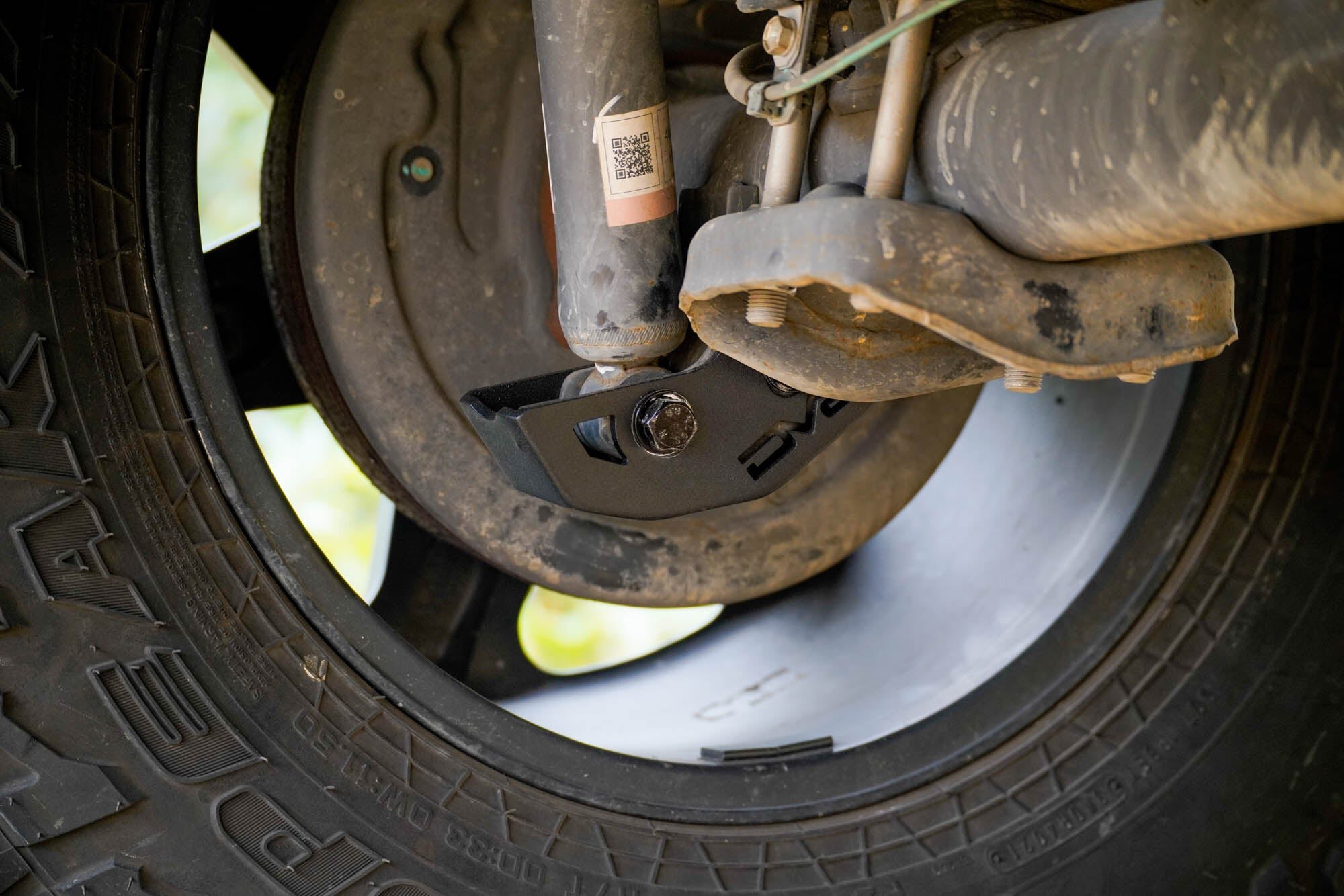 DV8 Offroad 2016-2023 Toyota Tacoma Rear Shock Skid Plates are built to shield your factory rear shocks from the rocks, debris, and trail impacts that can cause scratches, dents, and even blowouts on rough terrain. Designed with a slanted profile, these guards help deflect obstacles and function like a mini skid plate at a common contact point underneath your Tacoma.