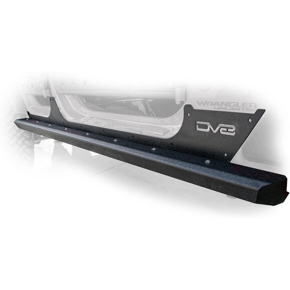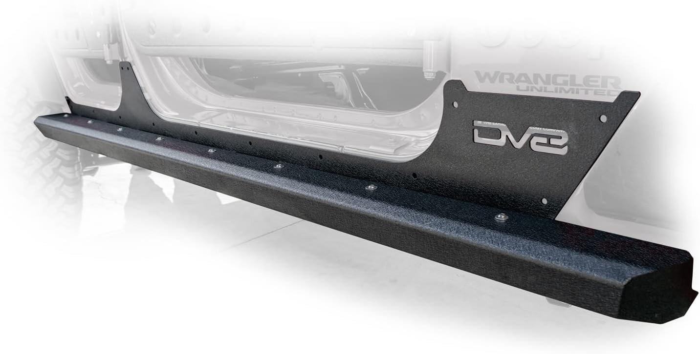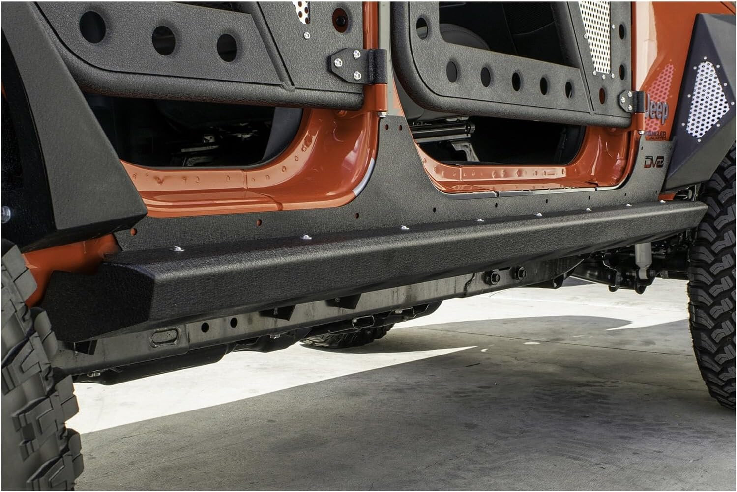 Dv8 Offroad Rock Slider with Rock Skin Kit for Wrangler JKU 4-Door delivers serious trail-ready protection and a clean, low-profile look. Built from precision-cut plated steel that’s bent and welded for strength, these boxed sliders wrap under the body to guard the frame rails and lower cab from rocks and obstacles while offering a minor step for convenience. The included rock skins mount to the body for added coverage, and the textured multi-stage powder coat with corrosion-resistant additives stands up to harsh environments. Designed for high clearance and durability, this DV8 setup is ideal for Jeep owners who want robust armor without bulky styling.