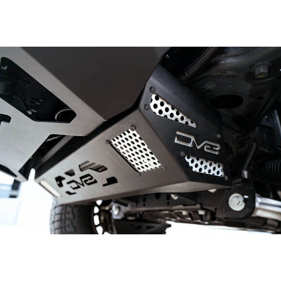 DV8 Offroad Steel Front Skid Plate delivers serious front-end protection for your Bronco’s most vulnerable components. Built from 3.5mm steel plates reinforced with 5mm steel supports, this skid plate is engineered to take on rugged trails while safeguarding the front undercarriage and sway bar disconnect on select trims. The micro-texture black powder coat resists corrosion and looks great, while paintable aluminum mesh inserts let you customize the look to match your build.