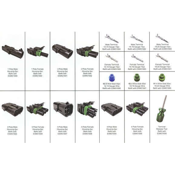 The Eastwood 209-Piece Crimp-Right Weather-Tight Tech Tray keeps all of your Eastwood Crimp-Right Weather-Tight accessories organized. Whether you want to repair your vehicle’s wiring harness like a pro or have other electrical work to do under the hood, you want to have the right waterproof wire connectors available. The Eastwood Crimp-Right Weather Pack multi-compartment tray is great for keeping your connectors together, accessible, and well stocked. Besides helping you find what you need fast, the easy-reference label on this weatherproof connector kit tells you quickly what you are looking for and what you need to replace. This kit includes 10 different style connectors, six different wire size terminals, and three easy-to-use wire seals. Contained in a handy tray to keep around the shop or garage or take with you on the road for mobile or emergency repairs. Eastwood provides lifetime technical support on all the weather-pack crimpers and connectors we sell. They are designed to help you do high-quality work on any vehicle's electronic system.
