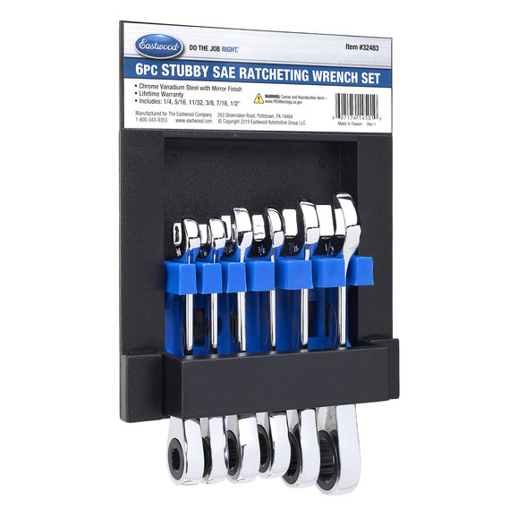 The Eastwood 6pc Stubby SAE Ratcheting Wrench Set is designed for superior durability thanks to its innovative Chrome Vanadium Steel design. No matter what is thrown at these ratcheting wrenches, they easily answer the call and stand up to the test of time. Backed by a full lifetime warranty and feature wrench sizes: 1/4", 5/16", 11/32", 3/8", 7/16", and 1/2".