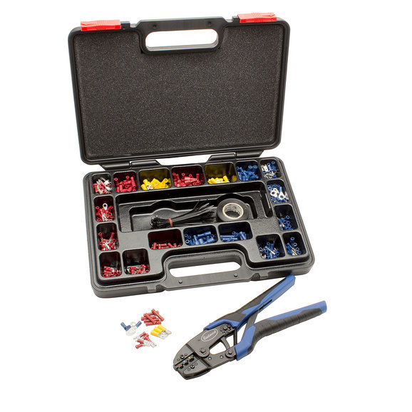 Automotive wire connector crimp kit helps save time and money on electrical work. An ideal package for someone who is new to restoration and is building a tool collection from scratch. The fully adjustable tool and hardware were designed by the Eastwood R&D guys who are experienced with wiring and know what gearheads need.- Features: