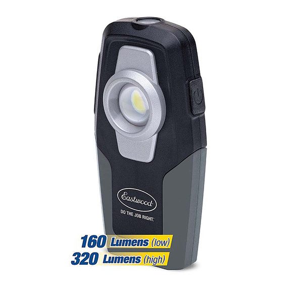 The Eastwood Rechargeable LED Palm Light with Flashlight is an all-in-one solution for mechanics and outdoorsmen. Featuring a two-mode palm light and top-mount flashlight that use chip-on-board (COB) LEDs, this flashlight offers an ultra-bright and uniform light spread. Enjoy up to six hours of illumination depending on the mode you choose via the four-position switch. You can hold this light in your hand, use the 180-degree pivoting magnet-mount base, or hang the light on the retractable rear hook. This light also boasts IP20 moisture resistance and a 2.5-hour recharge time via USB.