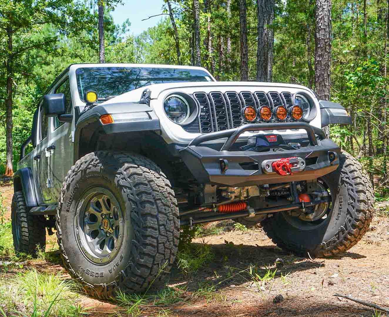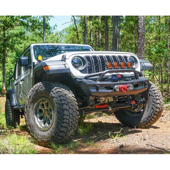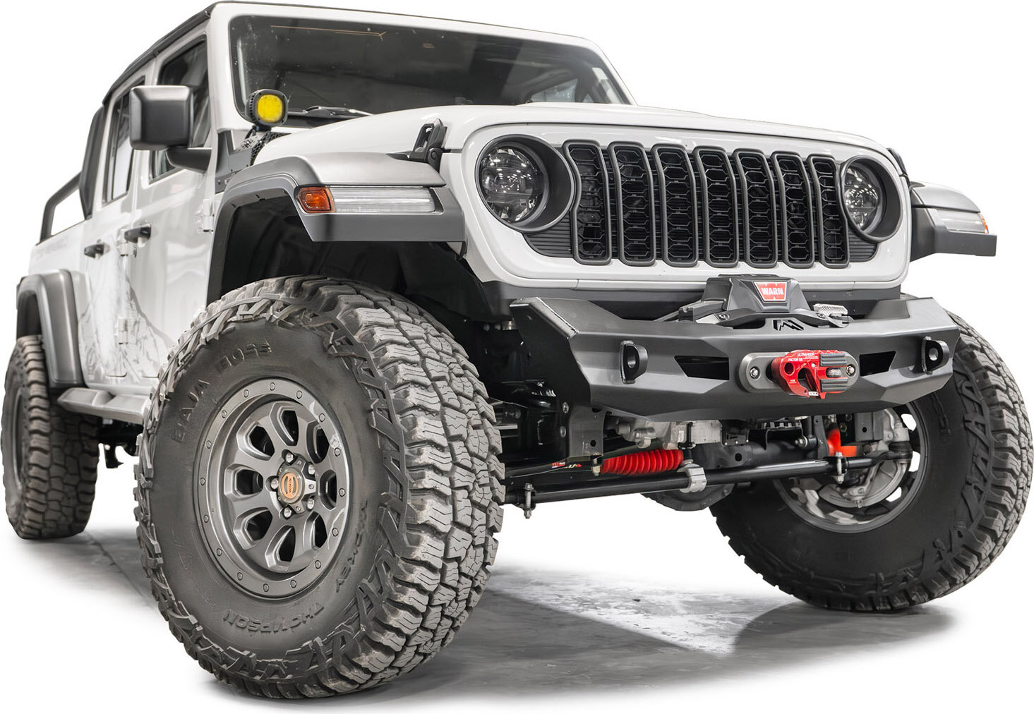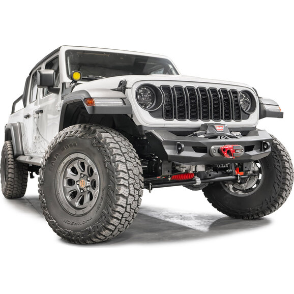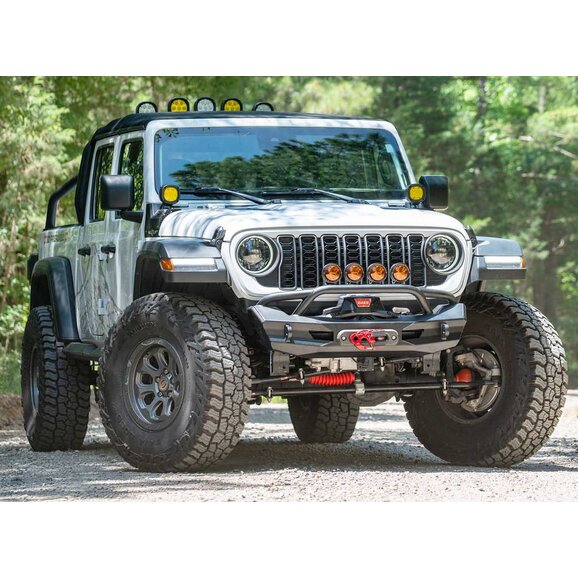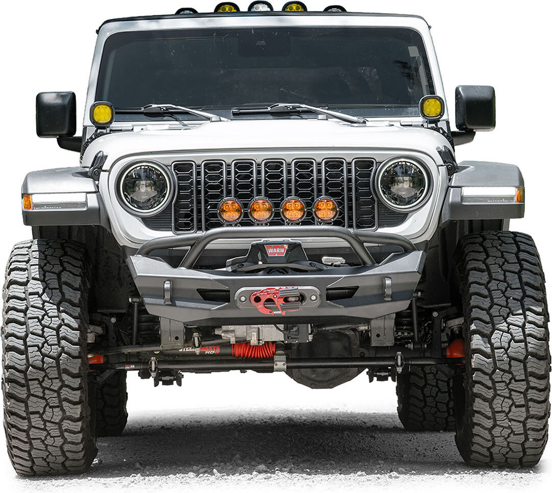 The Fab Fours Ghost Stubby Front Bumper for Jeep Wrangler JL and Gladiator JT delivers minimalist design with high-clearance performance. Crafted from rugged 3/16″ U.S. steel, it boasts a stealthy matte-black, two-stage powder-coat finish that blends toughness with refined styling. Its “stubby” profile hugs tight to the frame, optimizing approach angles without sacrificing protection. Winch-ready, it accommodates popular Warn Zeon 10, XD, or EVO winches, and offers integrated recovery points via D-ring mounts and tow hooks for serious off-road dependability. With capacity for up to four RIGID 360 Series 4″ round lights and compatibility with factory fogs or 3″ cube lights, the Ghost Stubby blends function and form perfectly.