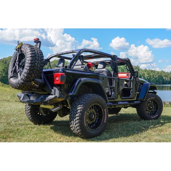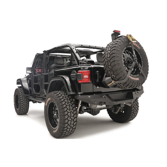 Adding the Fab Fours Slant Back Tire Carrier to your Wrangler JL will give it a great pre-runner look that will turn heads on the trails and let people know that you mean business. Made to complement their rear bumper this tire carrier has the ability to carry up to a 40" tire and includes a rear camera mount along with a mount for your third brake light & a 3-point tie down strap to keep the your spare tire safely secured. Rear bumper is sold separate.