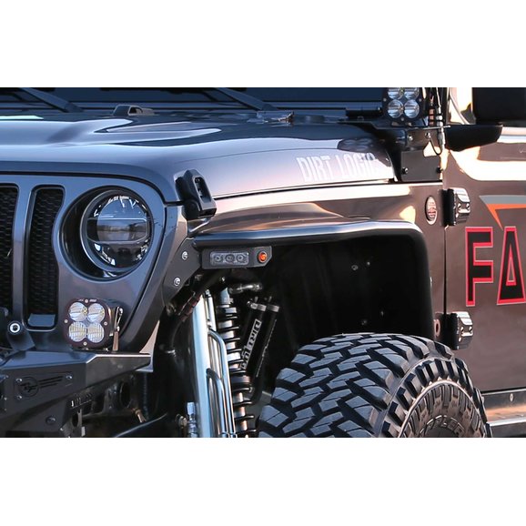 The Fabtech Front Steel Tube Fenders offer a 7.5" narrow design compared to the factory Jeep Wrangler JL or Gladiator JT front fender flares. Durable thick wall steel tubing makes up the frame with a steel top plate to withstand impacts. Finished with a textured black powdercoat for scratch resistance and style that will easily match other accessories. Models equipped with daytime running lights maintain that feature with the included LED light kit. The bolt-on design with plug and play wiring makes for a quick and easy installation.