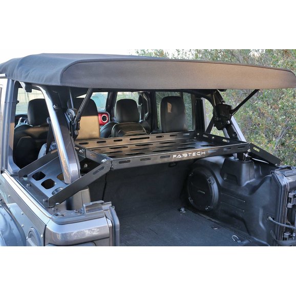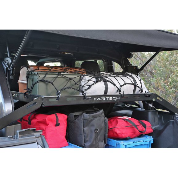 If you are taking your Wrangler Unlimited JL on vacation or a camping trip you will need all the extra room you can get for your gear. The Fabtech Interior Cargo Rack is a perfect solution to add more storage space to your JL. This heavy duty steel cargo rack goes behind your rear seat bolting into existing holes giving you an easy no drill installation. The slotted holes around the base of the rack allow for you to attach bungee cords or rope to hold down your cargo preventing it from sliding around or falling out.